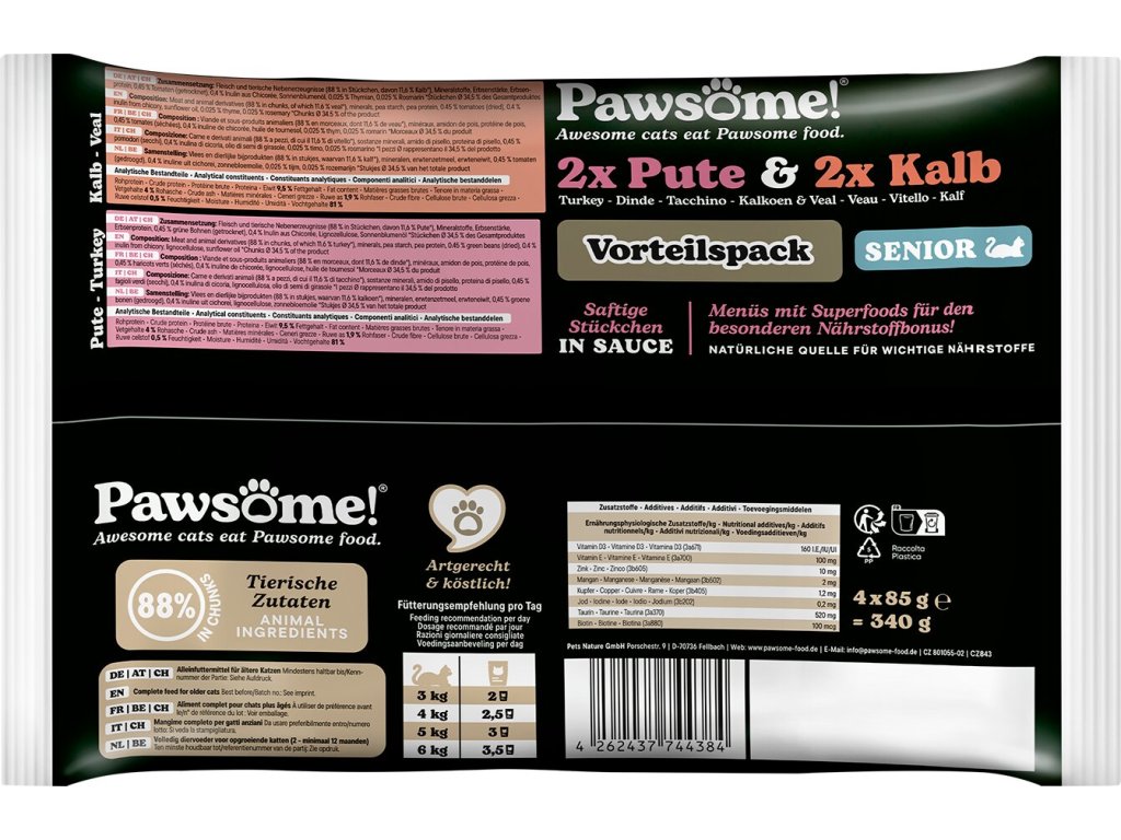 Složení Pawsome! Senior s telecím masem: maso a vedlejší výrobky živočišného původu (kousky masa 88 %, z toho telecí maso 11,6 %), minerální látky, hrachový škrob, hrachová bílkovina, sušená rajčata 0,45 %, čekankový inulin 0,4 %, slunečnicový olej, tymián 0,025 %, rozmarýn 0,025 %