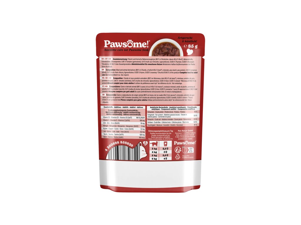 Krmivo Pawsome! je obohaceno o taurin, který přispívá k udržení zdravého zraku a normální činnosti srdce. Kočky si nedokáží taurin vyrobit samy, a proto je důležité nabídnout jim stravu, která jim tuto důležitou aminokyselinu poskytne.