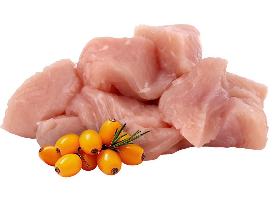 Složení: maso a vedlejší výrobky živočišného původu (kousky masa 88 %, z toho krůtí maso 40,6 %), minerální látky, hrachový škrob, hrachová bílkovina, lněný olej 0,5 %, inulin z čekanky 0,4 %, lignocelulóza, rakytník řešetlákový 0,05 %