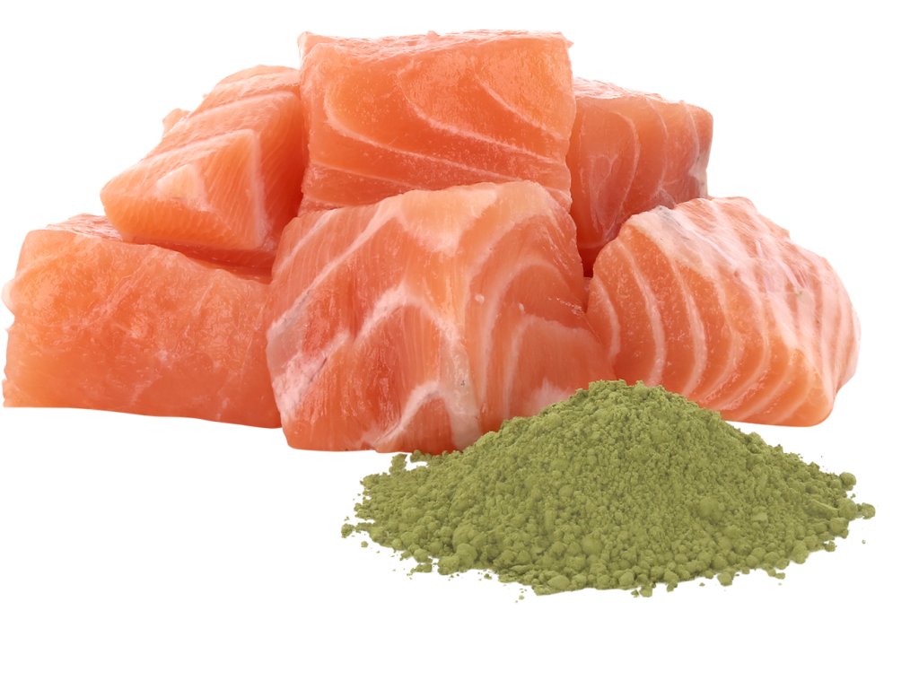 Složení: maso a vedlejší výrobky živočišného původu (kousky masa 74 %, z toho kuřecí maso 14 %), ryby a vedlejší výrobky z ryb (kousky lososa 14 %), minerální látky, hrachový škrob, hrachová bílkovina, inulin z čekanky 0,4 %, lignocelulóza, spirulina 0,05 %