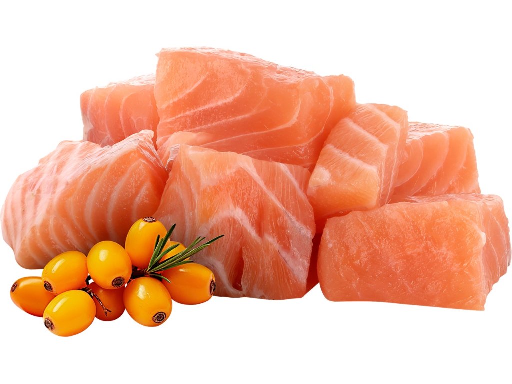 Složení: maso a vedlejší výrobky živočišného původu (kousky masa 73,5 %, z toho kuřecí maso 14 %), ryby a vedlejší výrobky z ryb (kousky lososa 14,5 %), minerální látky, lněný olej 1 %, hrachový škrob, hrachová bílkovina, inulin z čekanky 0,4 %, lignocelulóza, rakytník 0,1 %