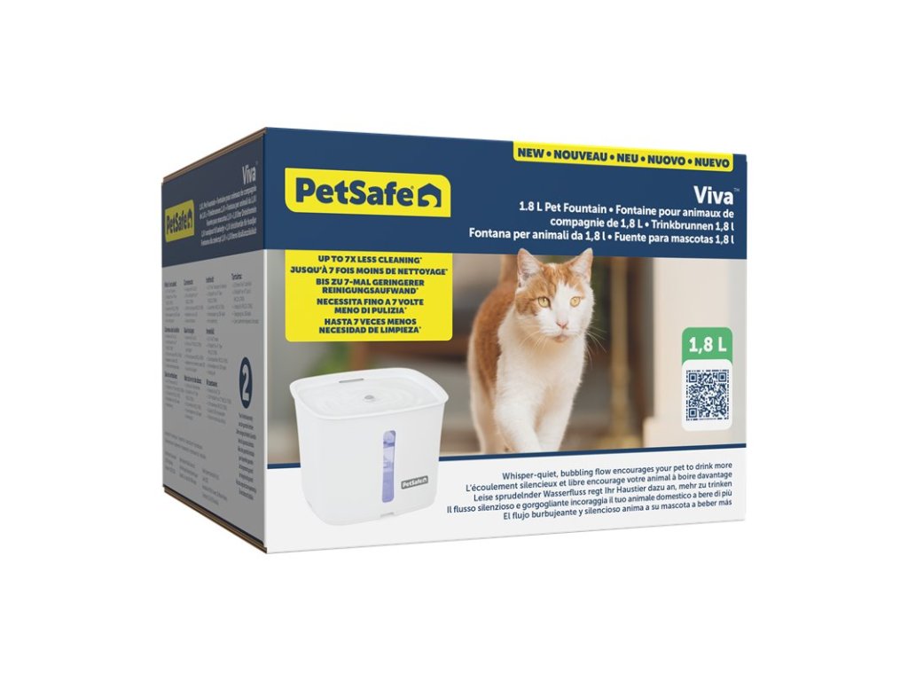 Dopřejte své kočce či pejskovi fontánku PetSafe® Viva™, do které se Váš mazlíček zamiluje hned na první doušek! Fontánka udržuje vodu stále čerstvou, což domácí mazlíčky motivuje k tomu, že budou pít více vody každý den. Dvojitá filtrace zajišťuje, že voda chutná skvěle a vypadá ještě čistěji. Díky těmto výhodám poskytuje fontánka Viva™ zážitek, který tradiční misky pro domácí zvířata prostě nedokáží nabídnout. Výhody, které nabízejí fontánky oproti klasickým miskám, neocení jen domácí mazlíčci. Oceníte je i vy, jejich starostliví rodiče. Díky používání fontán se můžete rozloučit s každodenním plněním a čištěním obyčejných misek na vodu! Pomozte svému mazlíčkovi zůstat zdravý a šťastný s touto 1,8 litrovou fontánkou Viva™ od PetSafe®. Fontánka Viva™ o objemu 1,8 litru je vhodná hlavně pro kočky či menší pejsky.