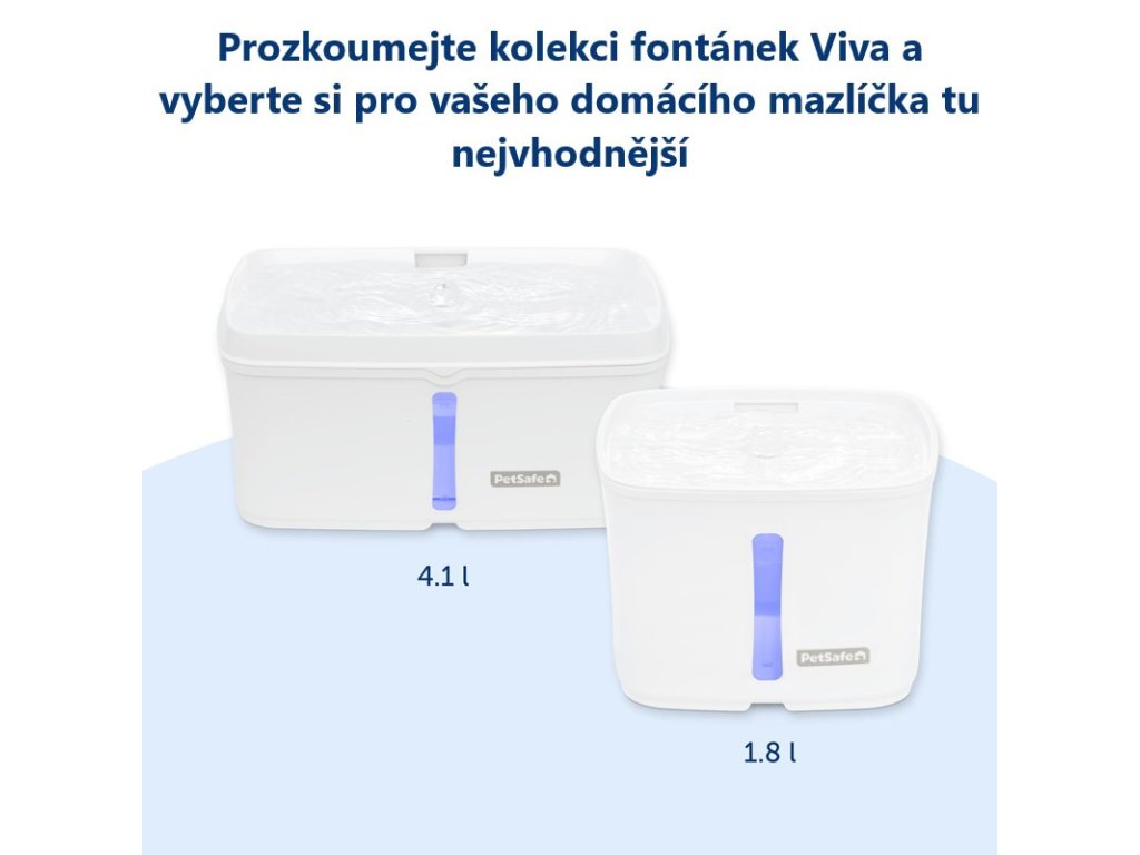Dopřejte svému pejskovi fontánku PetSafe® Viva™, do které se Váš mazlíček zamiluje hned na první doušek! Fontánka udržuje vodu stále čerstvou, což domácí mazlíčky motivuje k tomu, že budou pít více vody každý den. Dvojitá filtrace zajišťuje, že voda chutná skvěle a vypadá ještě čistěji. Díky těmto výhodám poskytuje fontánka Viva™ zážitek, který tradiční misky pro domácí zvířata prostě nedokáží nabídnout. Výhody, které nabízejí fontánky oproti klasickým miskám, neocení jen domácí mazlíčci. Oceníte je i vy, jejich starostliví rodiče. Díky používání fontán se můžete rozloučit s každodenním plněním a čištěním obyčejných misek na vodu! Pomozte svému mazlíčkovi zůstat zdravý a šťastný s touto 4,1 litrovou fontánkou Viva™ od PetSafe®. Fontánka Viva™ o objemu 4,1 litru je vhodná hlavně psy a domácnosti s více mazlíčky.