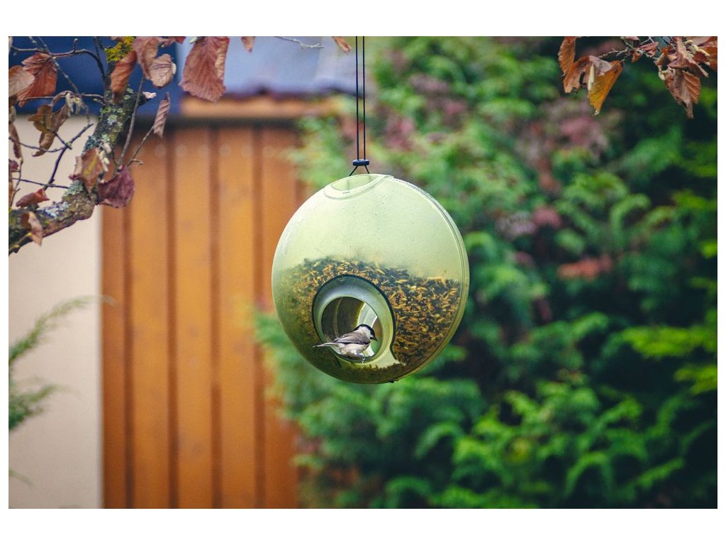 Krmítko s velkokapacitním zásobníkem umožňuje méně časté doplňování ptačí potravy.