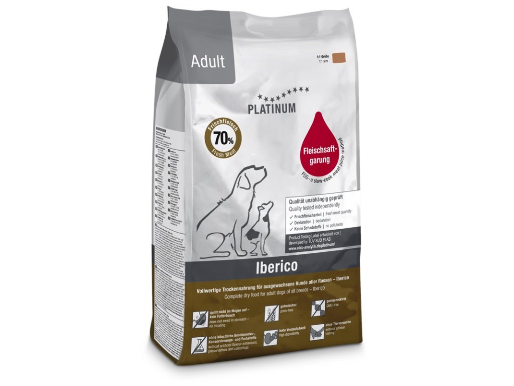 Platinum Natural Adult Iberico je přírodní krmivo pro dospělé psy všech plemen. Obsahuje maso z polodivokého černého vepře. Zdrojem kvalitních sacharidů jsou brambory. Krmivo je ve formě poloměkkých granulí, které jsou velmi dobře stravitelné a také se psům lépe přijímají.