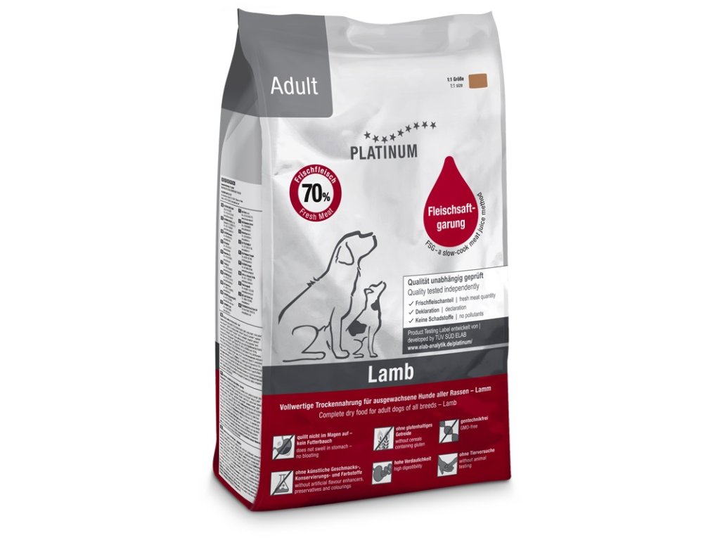 Platinum Natural Adult Lamb je přírodní krmivo s jehněčím masem a rýží pro dospělé psy. Obsahuje za studena lisované oleje (pro optimální poměr omega 3 a 6 mastných kyselin), výtažek ze slávky zelenoústé a vitamín K1 (pro optimální růst kostry a svalstva). 70 % surovin před zpracováním tvoří jehněčí maso.