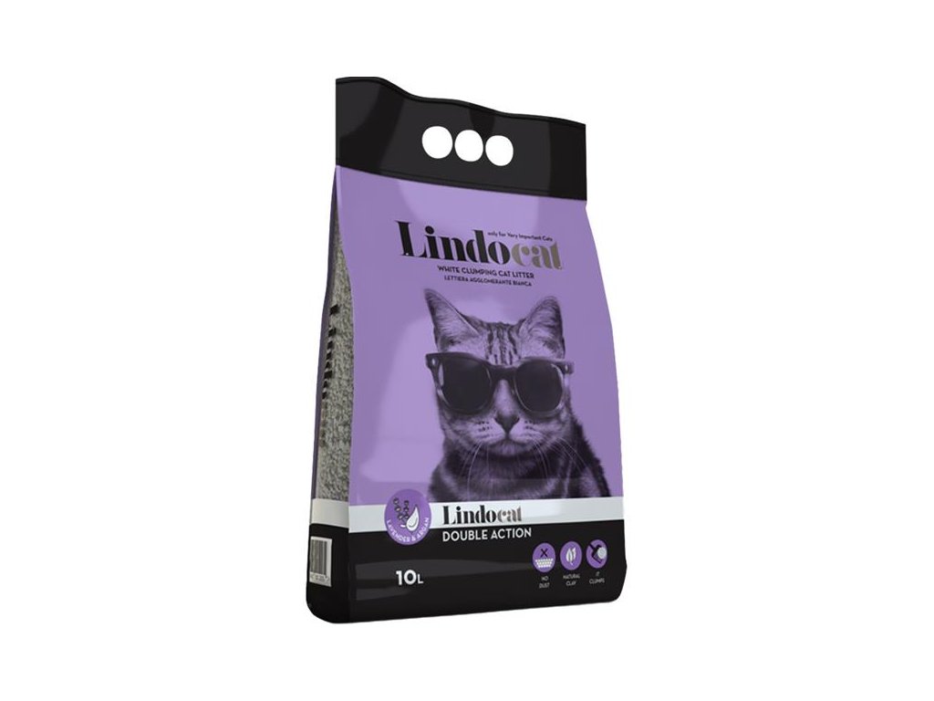 Lindocat Double Action s jemnou vůni levandule je hrudkující neprašné stelivo vyrobené ze 100% přírodního bílého bentonitu s fialovými granulkami. Díky svému složení a drobné velikosti zrn rychle a pevně hrudkuje a účinně absorbuje tekutiny a pachy. Hrudky se vybírají snadno a s minimálními ztrátami steliva.