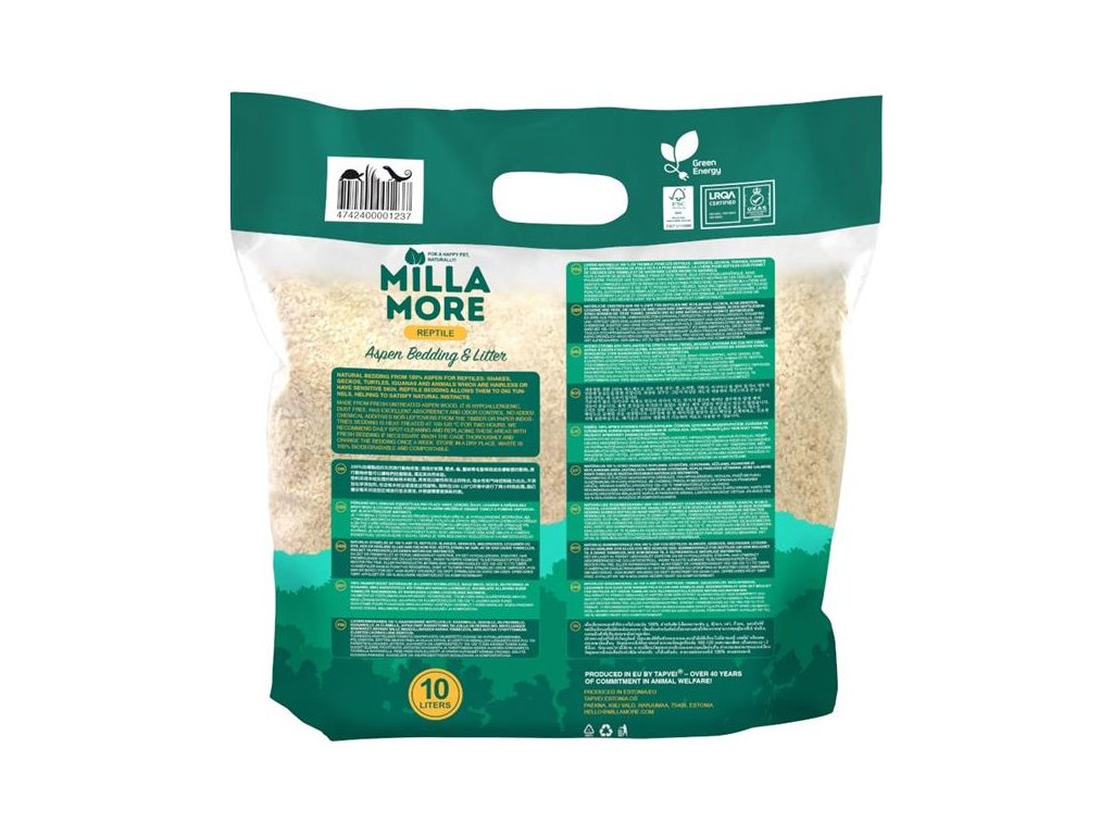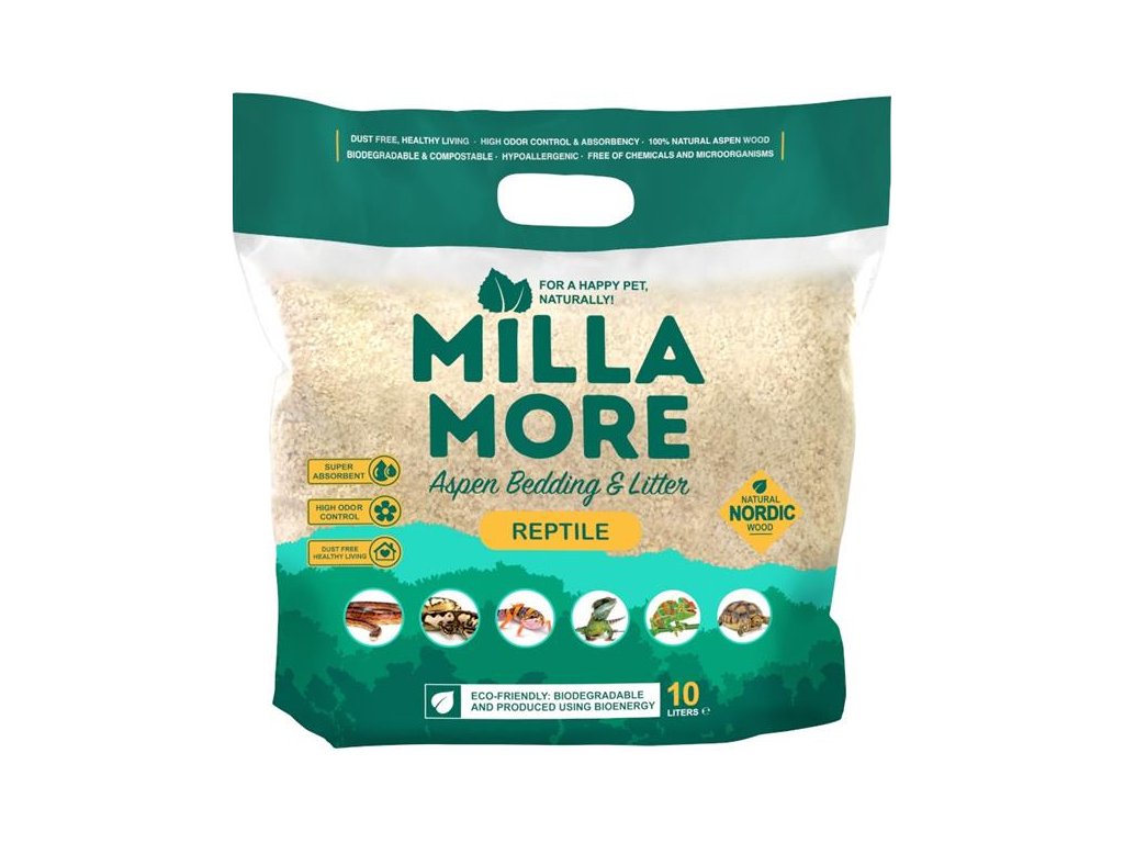 Přírodní stelivo z jemné osikové štěpky je vhodné pro hady, želvy, leguány a další zvířata bez srsti nebo s citlivou pokožkou. Podestýlka umožňuje zvířatům hrabat tunely a pomáhá tak uspokojit jejich přirozené instinkty.Podestýlky Millamore jsou vyrobeny z čistého, neošetřeného osikového dřeva (Populus tremula), bez příměsi zbytků ze zpracování dřeva nebo papíru. Ve srovnání s jehličnany má osikové dřevo navíc nízký obsah pryskyřic a neobsahuje fenoly.Steliva Millamore mají vynikající hygienické vlastnosti a jsou bezpečná pro zvířata i lidi. Osikové dřevo se suší při vysokých teplotách (přes 100 °C), a má díky tomu vysokou schopnost absorpce tekutin i zápachu a neobsahuje bakterie, plísně ani houby. Podestýlky z osikového dřeva s laboratorně ověřenou bezpečností doporučují i veterinární lékaři.