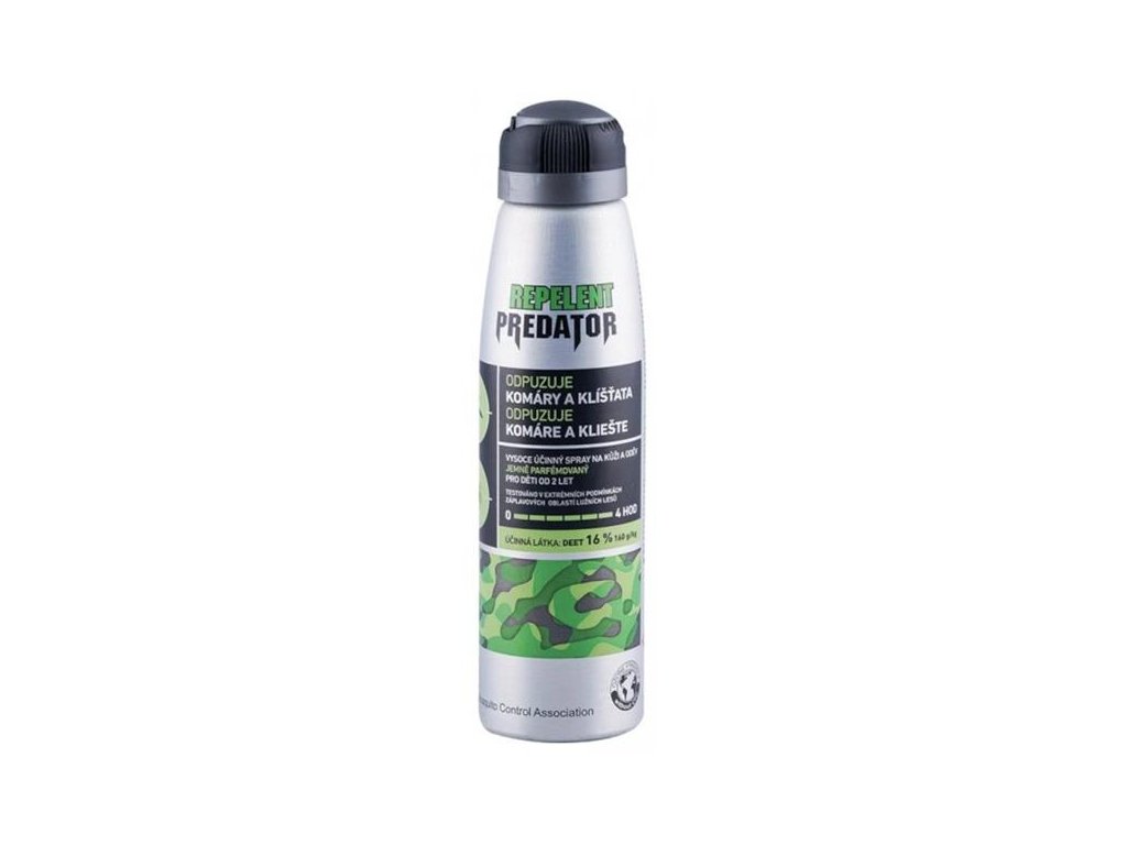 Univerzální aerosolový repelent Predator 16 % proti komárům, klíšťatům a muchničkám vhodný k aplikaci na pokožku i oděv. Lze použít ve všech zeměpisných pásmech proti všem druhům komárů a klíšťat včetně tropických.Výhoda aerosolové aplikace spočívá v dokonalejším rozptýlení na všechny části těla, obuvi a oděvů. Toho docílíte u výrobků Predator díky 360° ventilu, dokonalému roztoku a jemnému rozprašování.Tohoto efektu nedocílíte u sprejů s mechanickým rozprašovačem, kde při rozprašování ošetříte jen ohraničené kruhy, mezi nimiž zůstane neošetřené místo, na které se hmyz dostane a bodne.Pro děti od 2 let.Doba účinnosti 2–4 hodiny.