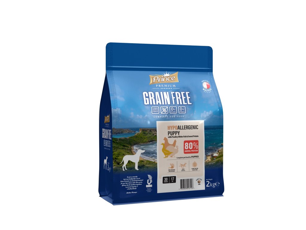 PRINCE HYPOALLERGENIC PUPPY 2KG - s drůbežím masem, bílou rybou a sladkými bramboramikompletní krmivo pro štěňataPokud hledáte HYPOALERGENNÍ krmivo bez obilovin, bez lepku, bez GMO a bez plnidel, je řada PRINCE PREMIUM GRAIN FREE ta správná volba!Dopřejte svému pejskovi bezobilnou řadu PRINCE. Prémiové suché krmivo pro psy bez obilovin, pečlivě vyvinuté pro psy všech věkových kategorií. Kvalitní krmivo plné esenciálních živin. Tato výjimečná receptura přináší mnoho výhod, díky nimž bude váš mazlíček prospívat.
