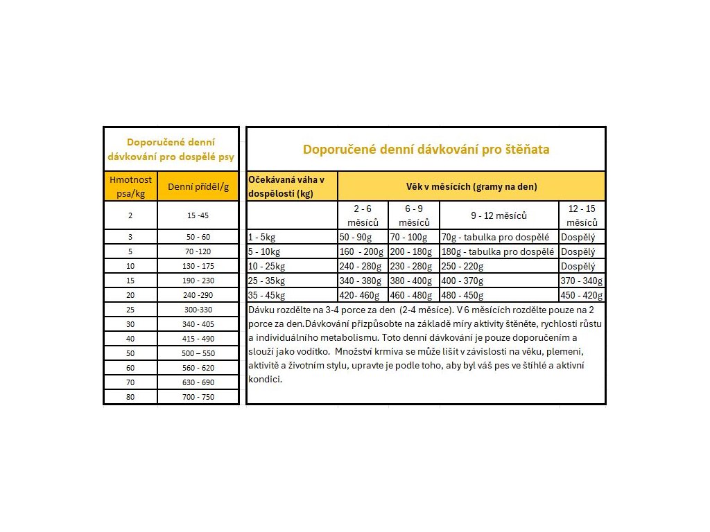 Denní dávkování je pouze doporučením a slouží jako vodítko. Množství krmiva se může lišit v závislosti na věku, plemeni, aktivitě a životním stylu, upravte je podle toho, aby byl váš pes ve štíhlé a aktivní kondici.