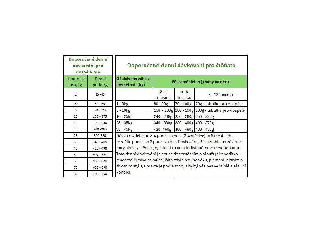 Denní dávkování je pouze doporučením a slouží jako vodítko. Množství krmiva se může lišit v závislosti na věku, plemeni, aktivitě a životním stylu, upravte je podle toho, aby byl váš pes ve štíhlé a aktivní kondici.