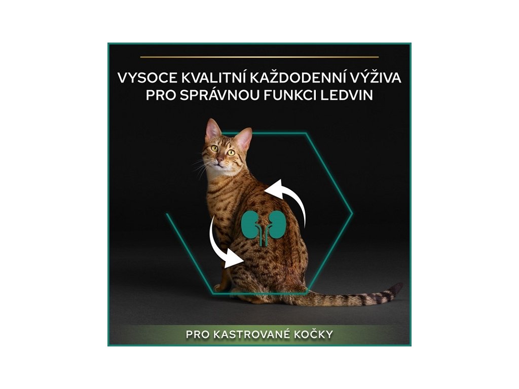 Pro Plan Cat Sterilised Renal Plus Turkey je kompletní krmivo speciálně vyvinuté pro kastrované kočky. Po kastraci kočky často mívají nižší energetickou spotřebu a zároveň vyšší pocit hladu, čímž se zvyšuje riziko nadváhy. Krmivo Sterilised Renal Plus s vysoce kvalitními krůtími kousky pomáhá udržovat ideální tělesnou hmotnost, zdravé močové cesty a zdravou funkci ledvin, jelikož dokáže ovlivnit oxidační parametry už za šest týdnů. Správné fungování ledvin podporuje také vitamín E, vitamín C, beta-karoteny, omega-3 mastné kyseliny s dlouhým řetězcem a arginin.