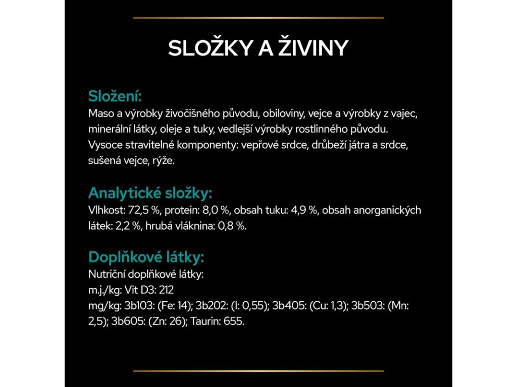 Doplňkové látky: Nutriční doplňkové látky: m.j./kg : vit D3 : 212 mg/kg : 3b103 : (Fe: 14); 3b202 : (I: 0,55); 3b405 : (Cu: 1,3); 3b503 : (Mn: 2,5); 3b605 : (Zn: 26); taurin: 655.