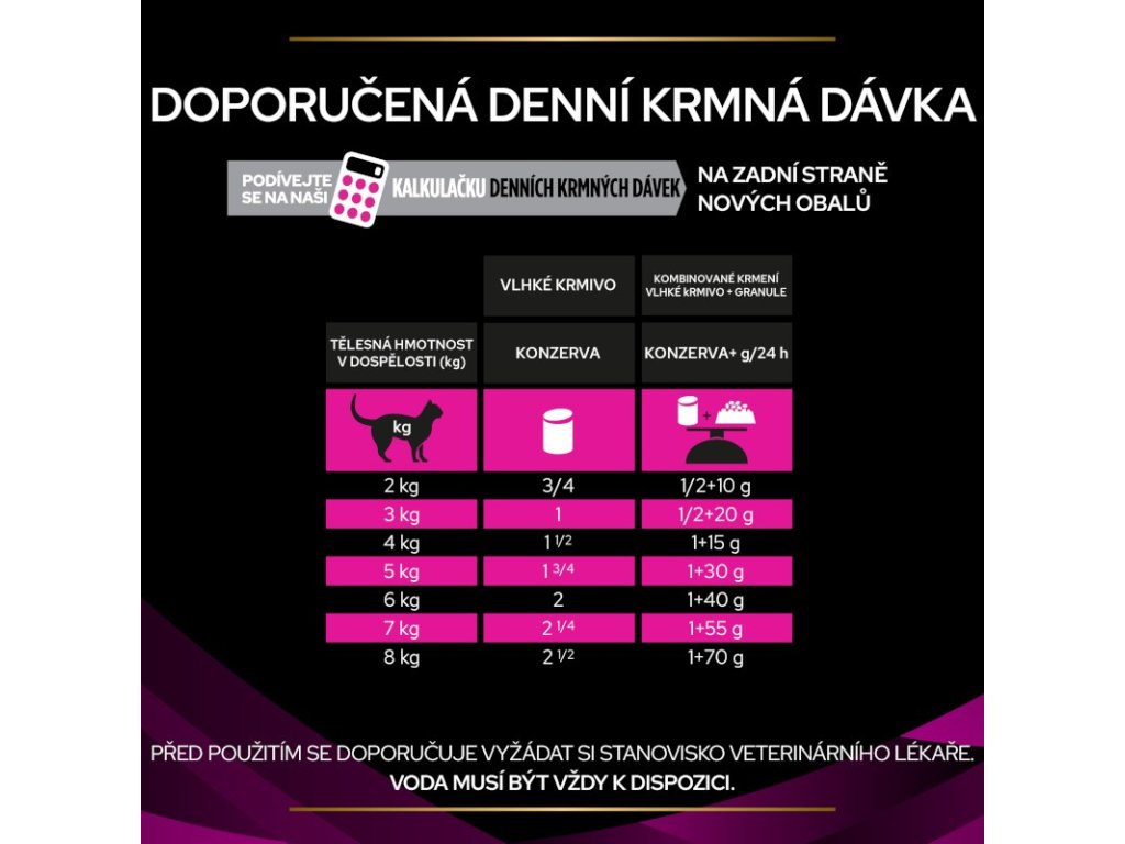 Doporučená doba používání je 5 až 12 týdnů pro rozpuštění struvitových kamenů; a od počátku do 6 měsíců pro omezení jejich opakované tvorby. Před použitím nebo před prodloužením doby používání se doporučuje vyžádat si stanovisko veterinárního lékaře. Voda musí být vždy k dispozici. Při kombinovaném krmení suchým a vlhkým krmivem se řiďte doporučením na obale granulí PPVD UR St/Ox Urinary™. Kočky s hmotností nad 6 kg: na každý další kg tělesné hmotnosti navyšte denní krmnou dávku o 1/3 konzervy.