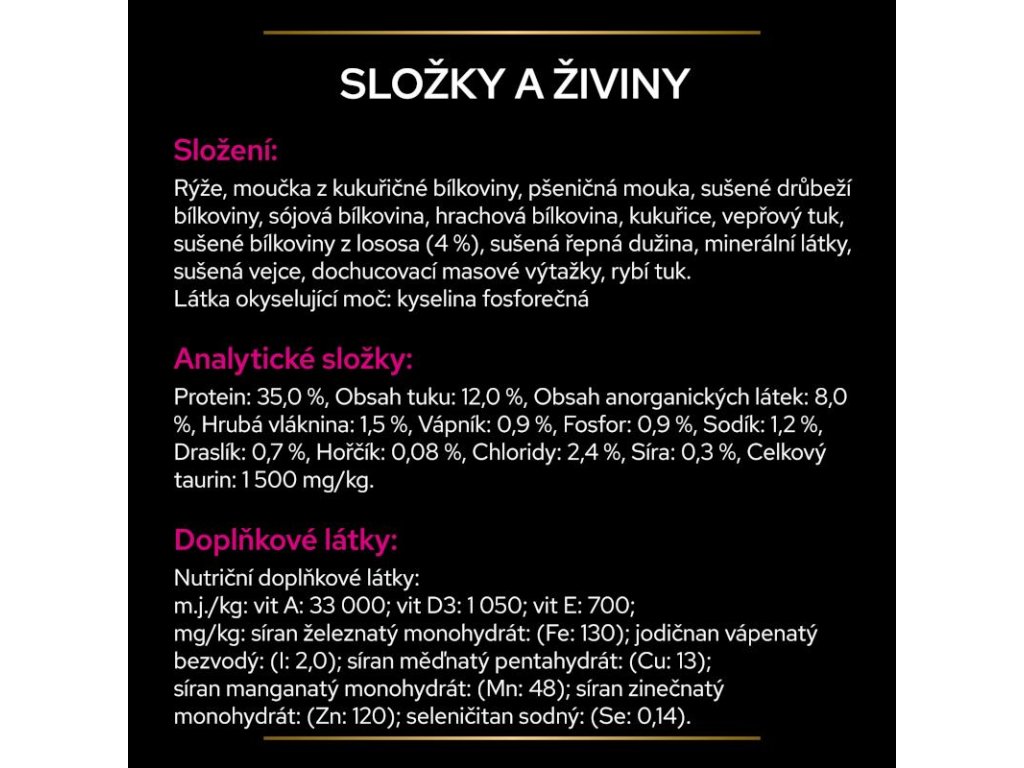 rýže, moučka z kukuřičné bílkoviny, pšeničná mouka, sušené drůbeží bílkoviny, sójová bílkovina, hrachová bílkovina, kukuřice, vepřový tuk, sušené bílkoviny z lososa (4 %), sušená řepná dužina, minerální látky, sušená vejce, dochucovací masové výtažky, rybí tuk, látka okyselující moč: kyselina fosforečná.