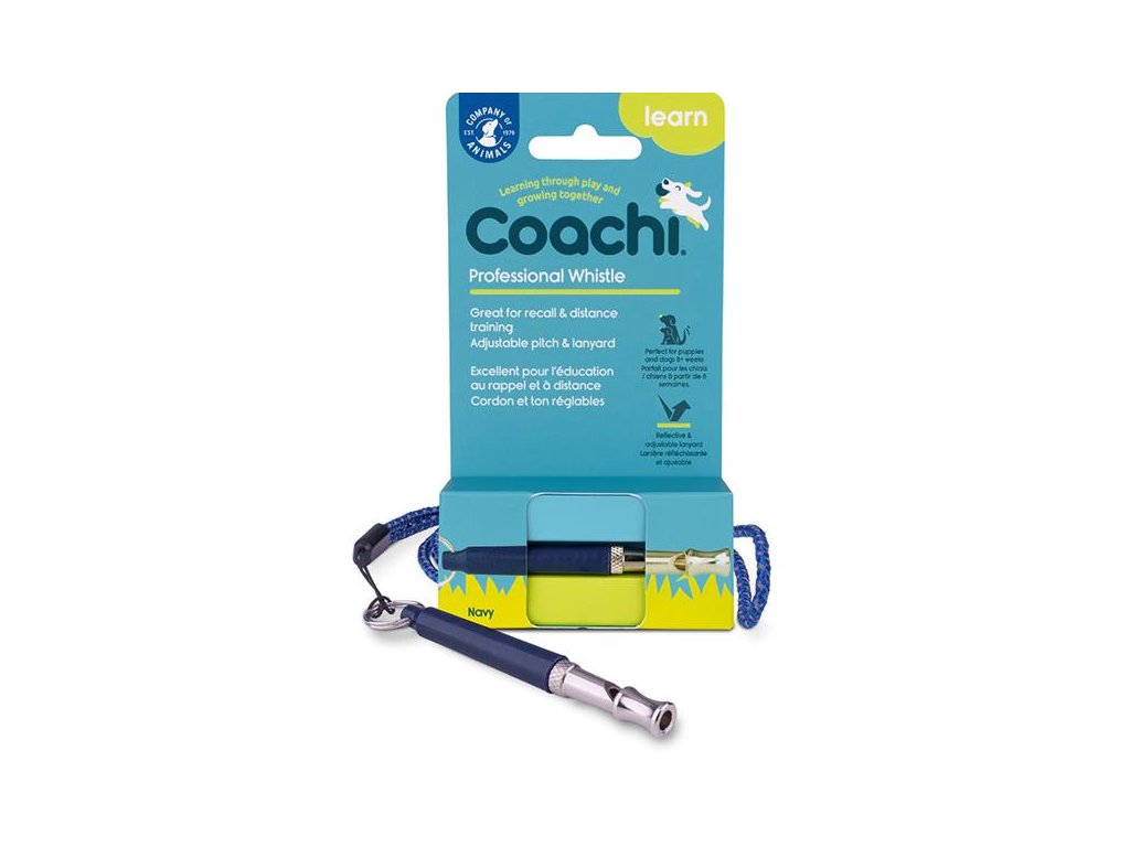 Coachi Professional Training Whistle je píšťalka určená pro profesionální výcvik štěňat a dospělých psů. Umožňuje měnit výšku a intenzitu tónu podle citlivosti psa, pro nácvik různých povelů nebo pro současný trénink více psů. Výška a intenzita tónu se upravuje pootočením matice po rozpojení plastové a kovové části píšťalky. Píšťalka Je lehká, odolná a opatřená reflexním provázkem s nastavitelnou délkou pro pověšení na krk nebo na zápěstí. Má jasný, silný a stabilní zvuk, dobře slyšitelný na dálku.