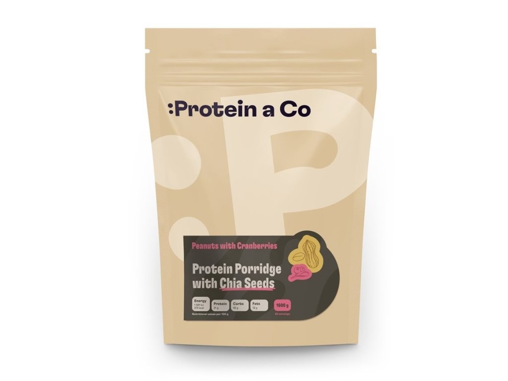 Složení: ovesné vločky (min. 35 %), 80 % syrovátkový koncentrát (min. 20 %), chia (min. 3 %), arašídy (min. 3 %), brusinky (min. 5 %), kokosový cukr BIO, sušené mléko