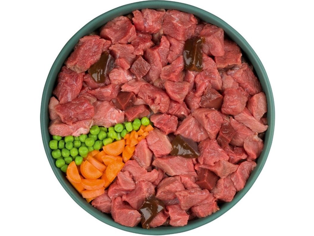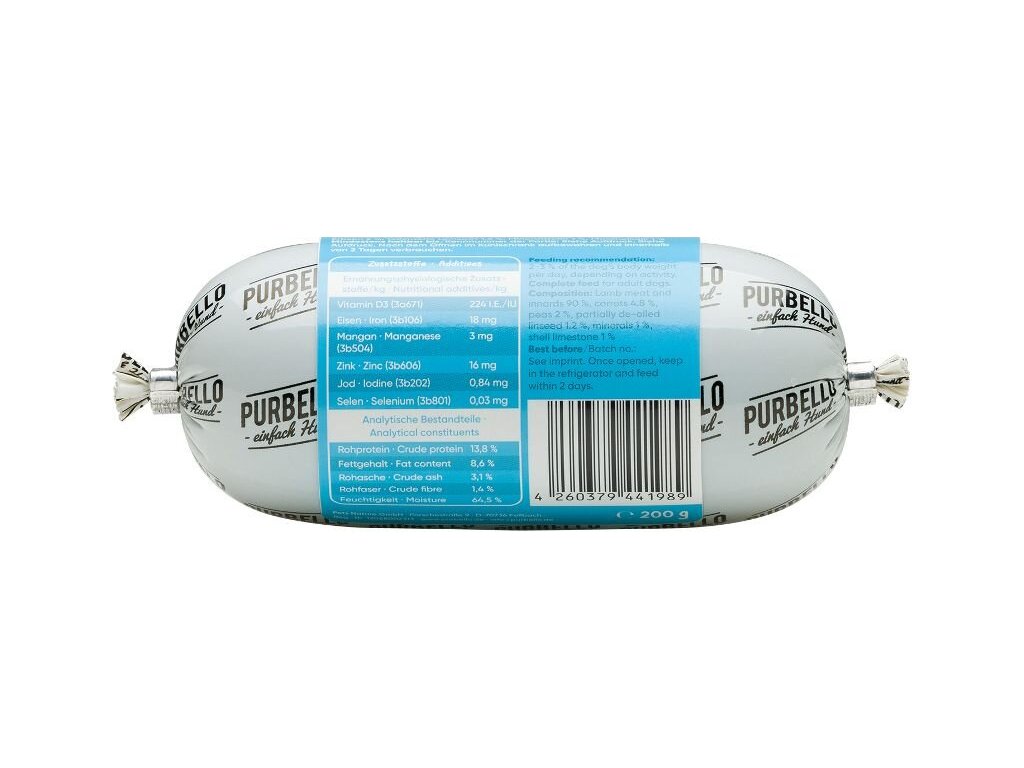 Složení: jehněčí maso a jehněčí vnitřnosti 90%, mrkev 4,8%, hrášek 2%, lněné semínko 1,2%, minerály 1%, vápenec 1%