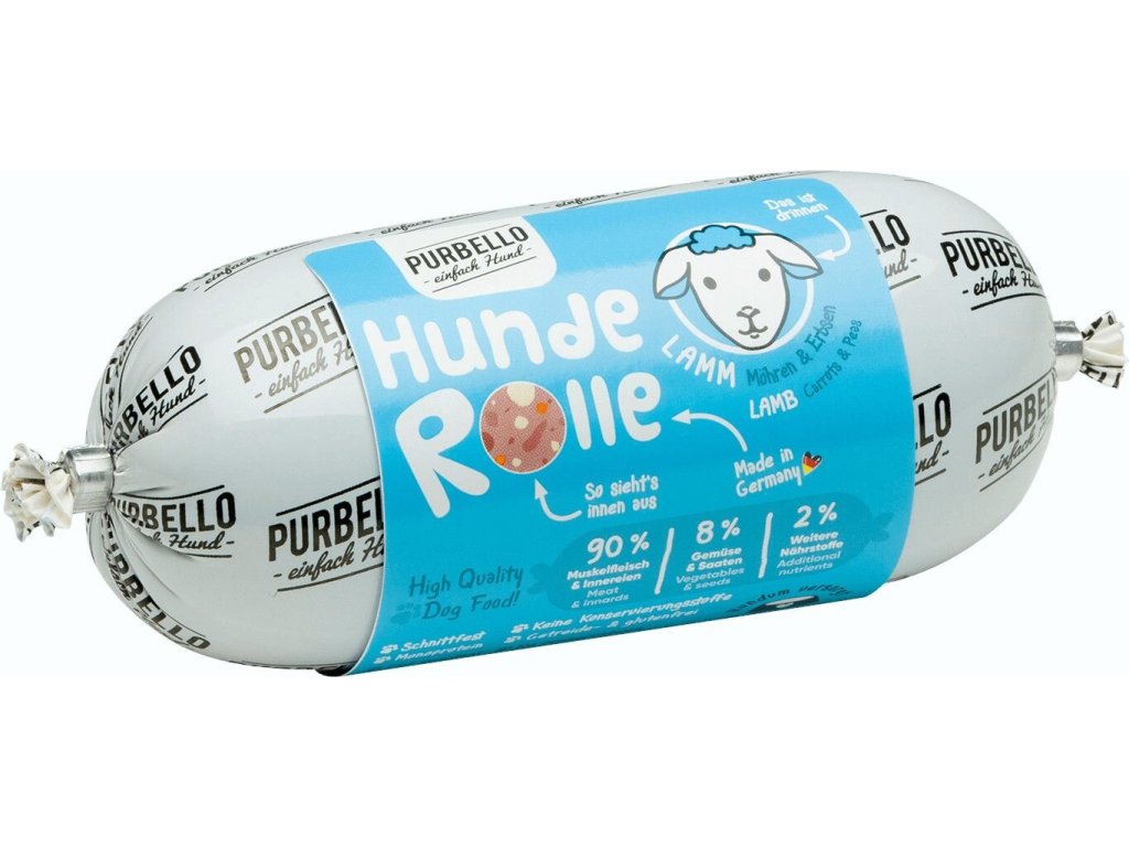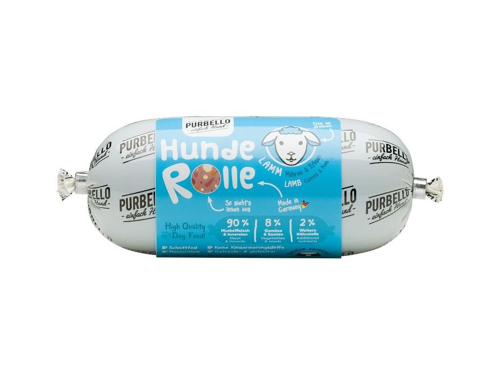Zdravý a chutný masový salám, který obsahuje 90 % čerstvého jehněčího masa, mrkev, hrášek a lněné semínko.