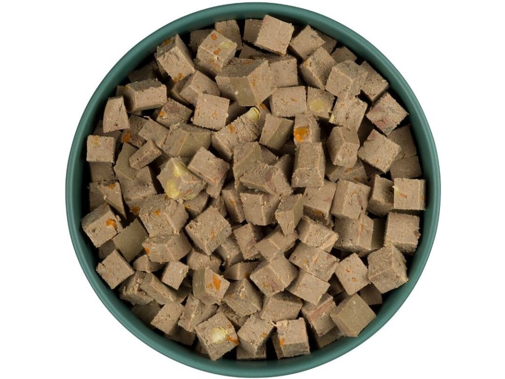 Složení: jehněčí maso a jehněčí vnitřnosti 90%, mrkev 4,8%, hrášek 2%, lněné semínko 1,2%, minerály 1%, vápenec 1%
