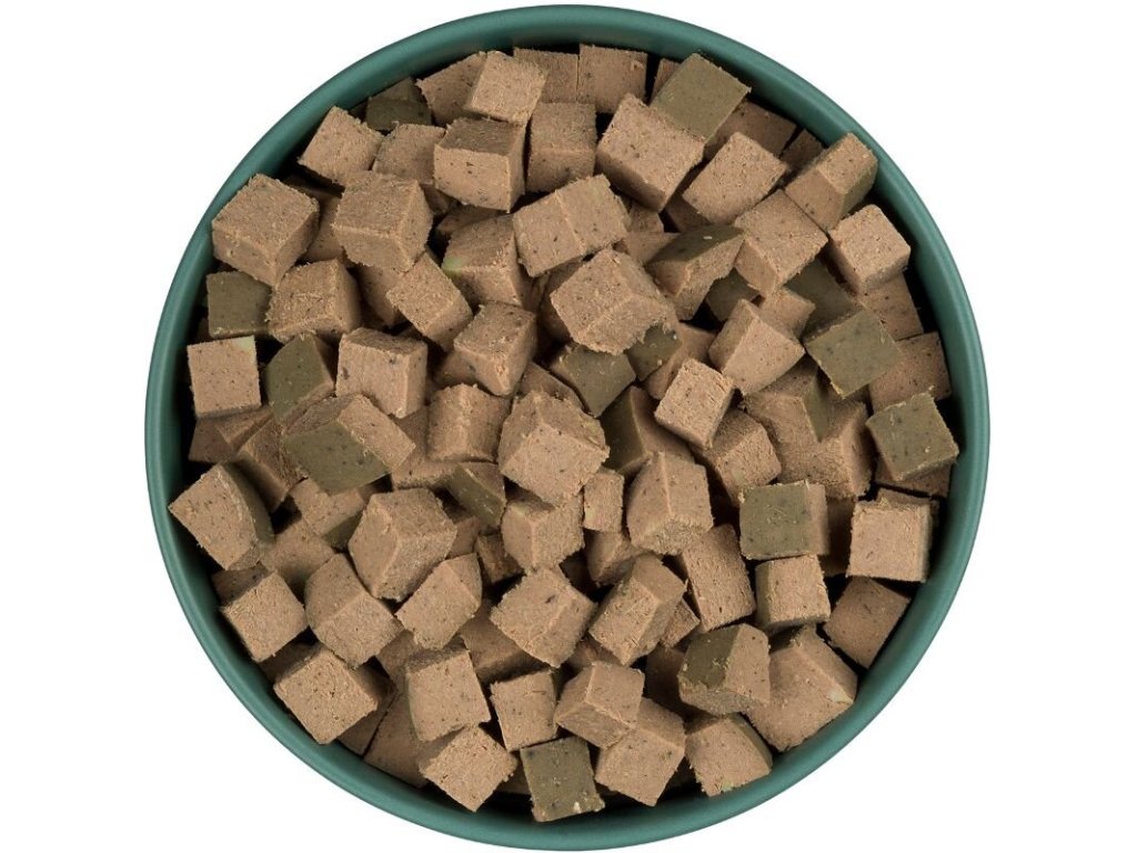 Složení: kachní maso a kachní vnitřnosti 90%, brambory 5,5%, bylinky 2,5%, minerály 1%, vápenec 1%