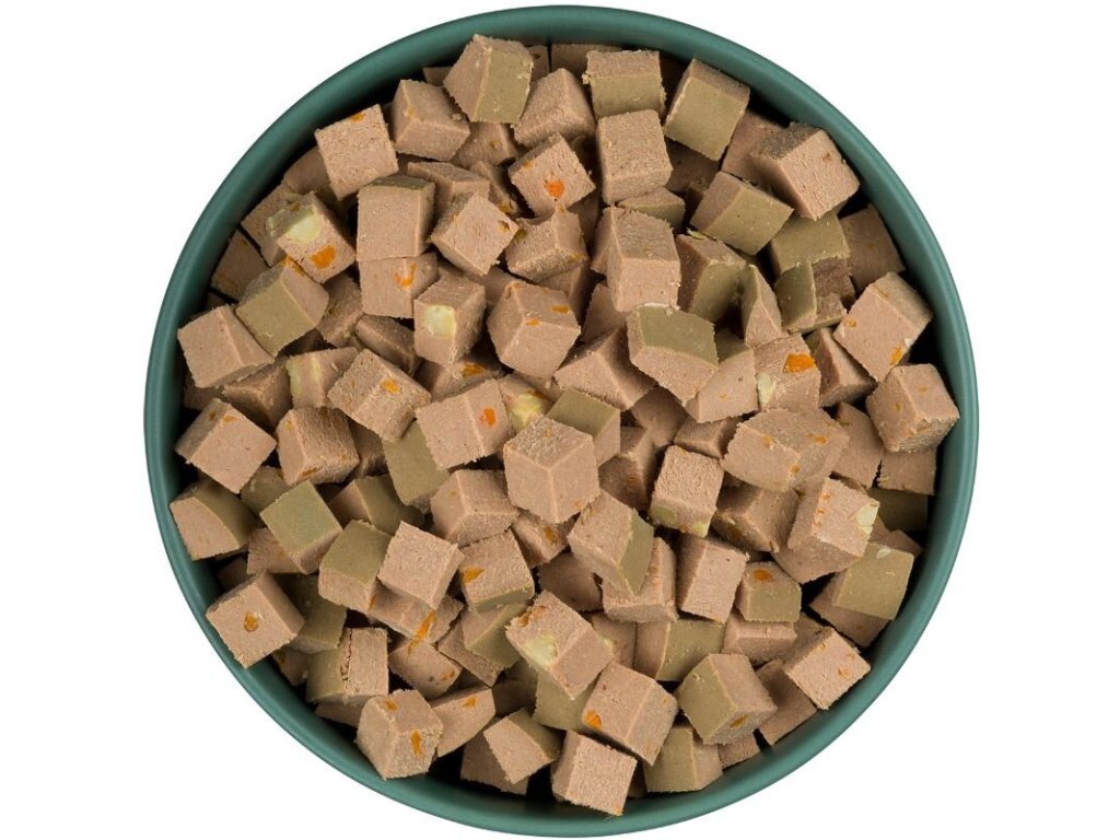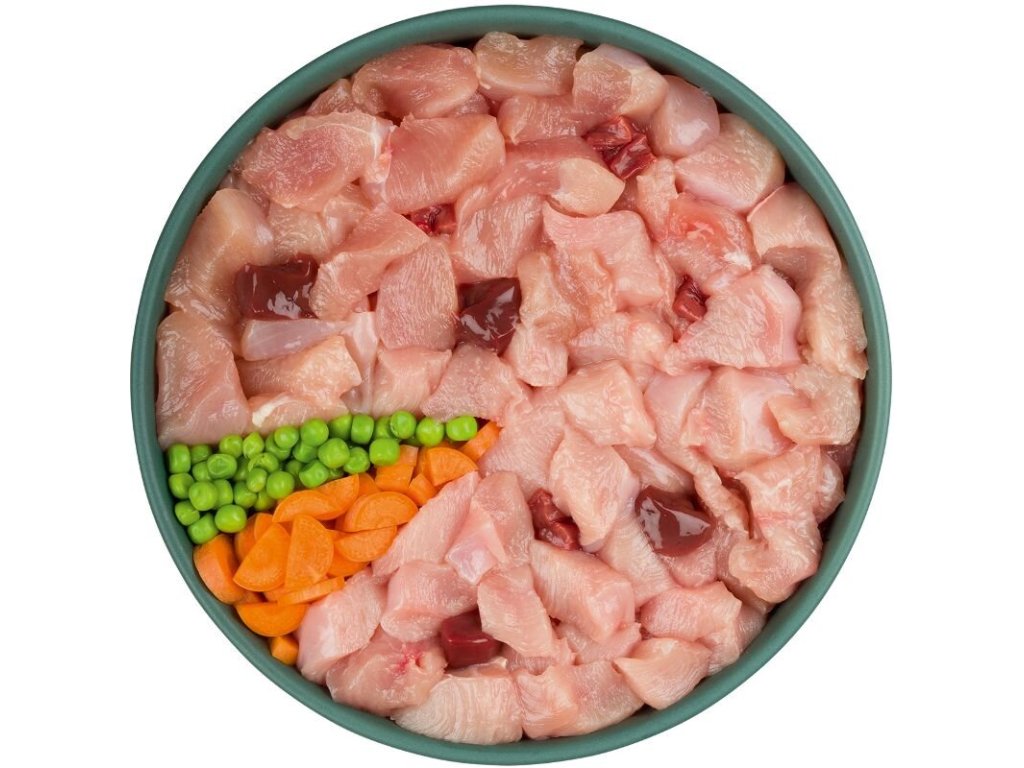 Složení: kuřecí maso a droby 90%, mrkev 5%, hrášek 3%, minerály 1%, vápenec 1%
