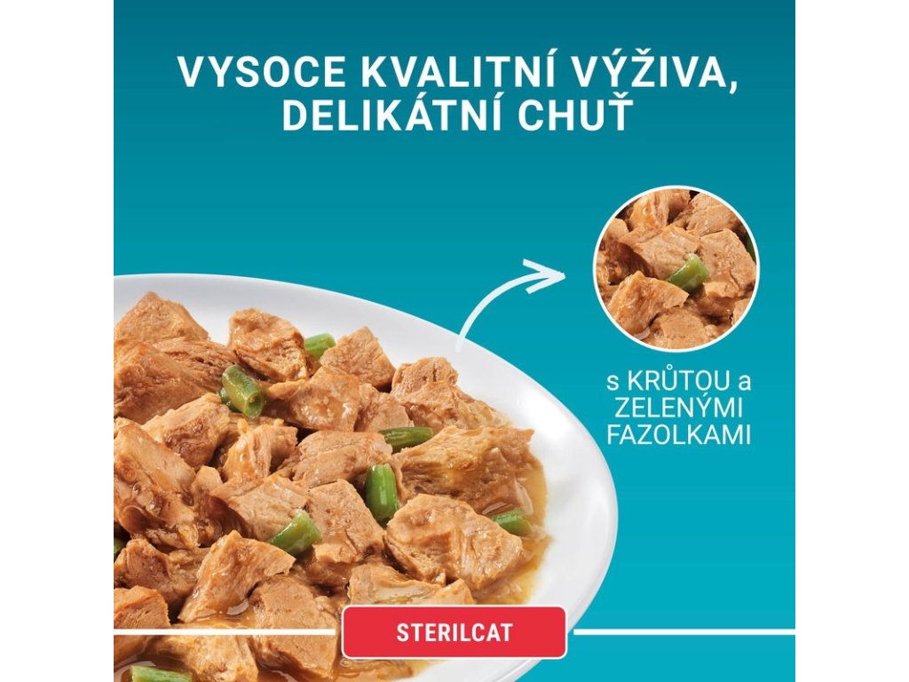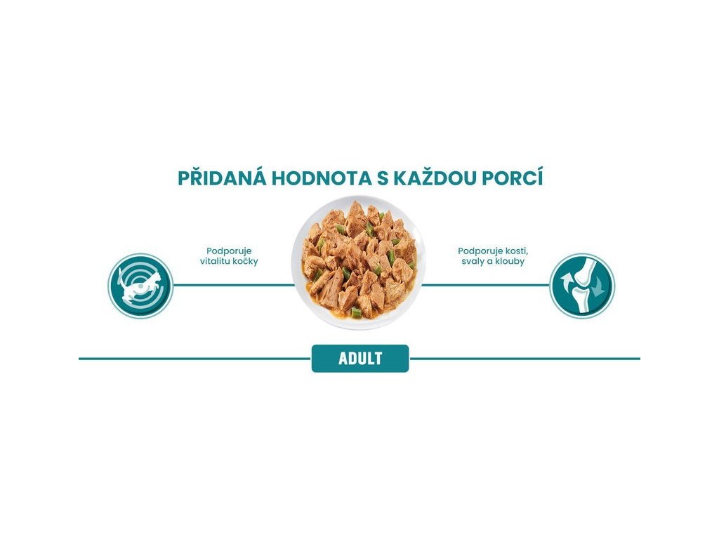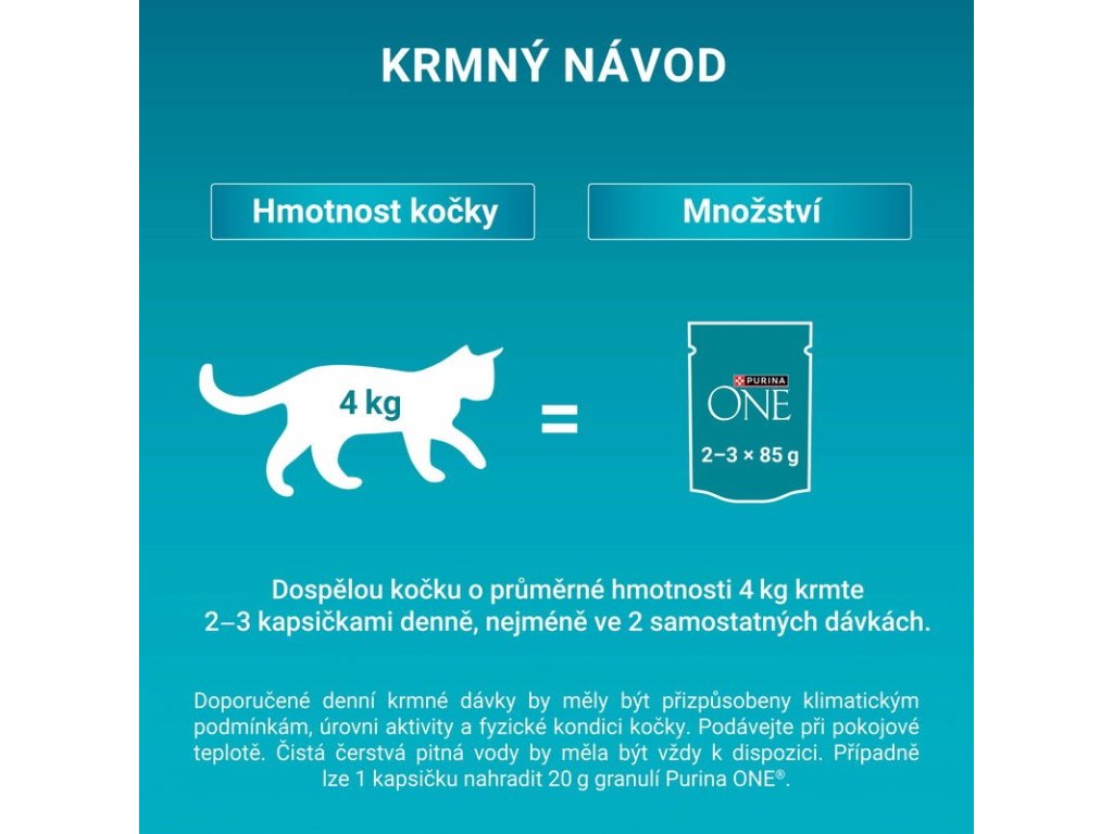 Dávkování krmiva: Dospělou kočku o průměrné hmotnosti (4 kg) krmte 3 až 4 kapsičkami denně, nejméně ve 2 samostatných dávkách. Doporučené denní krmné dávky by měly být přizpůsobeny klimatickým podmínkám, úrovni aktivity a fyzické kondici kočky. Podávejte při pokojové teplotě. Čistá čerstvá pitná voda by měla být vždy k dispozici.