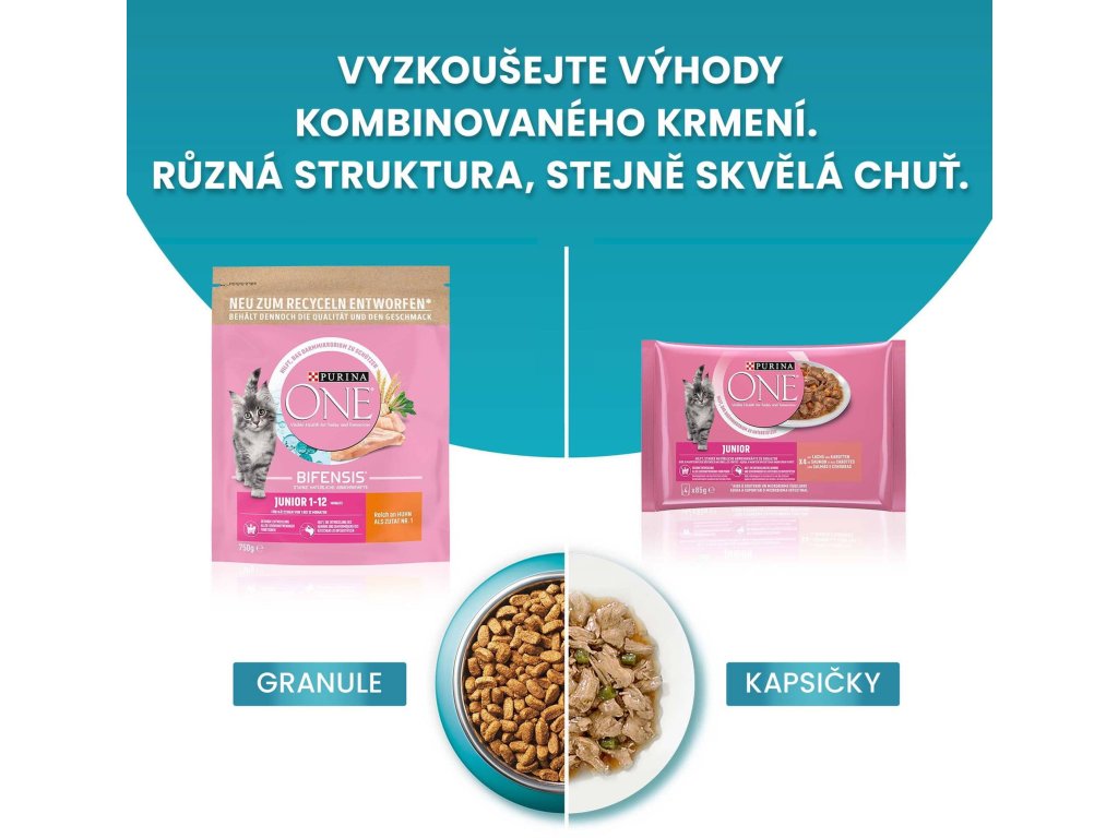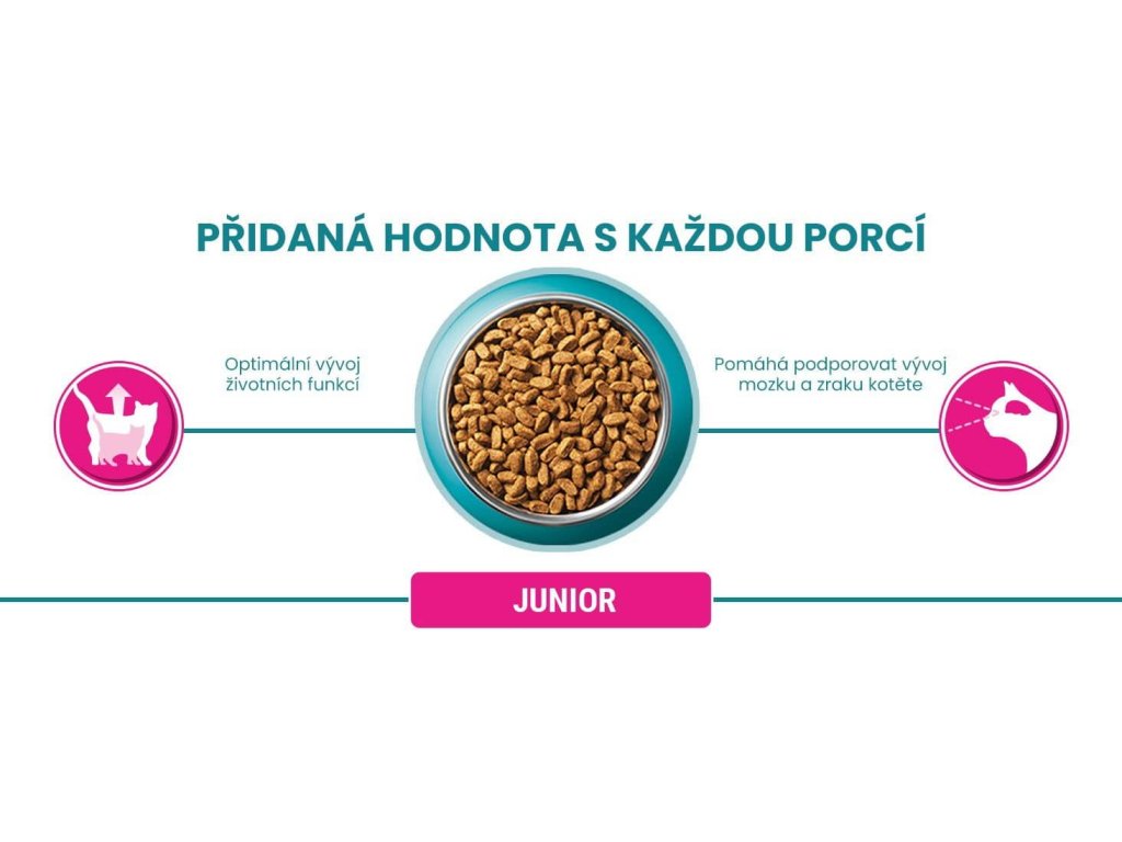 Purina ONE® Junior je receptura speciálně navržená pro výživové potřeby koťat (od odstavení do 12 měsíců) a pro březí a kojící kočky. Pro zdraví vaší kočky je nezbytný vyvážený střevní mikrobiom. Ten má přímý dopad na její imunitní systém. Mikrobiom je tvořen biliony mikroorganismů, které žijí ve střevech a jsou pro každou kočku unikátní. Rovnováha mikroorganismů je důležitá pro dobré zažívání a má pozitivní vliv na imunitní systém a celkovou pohodu vaší kočky.