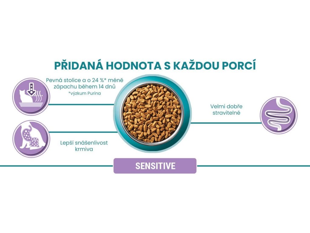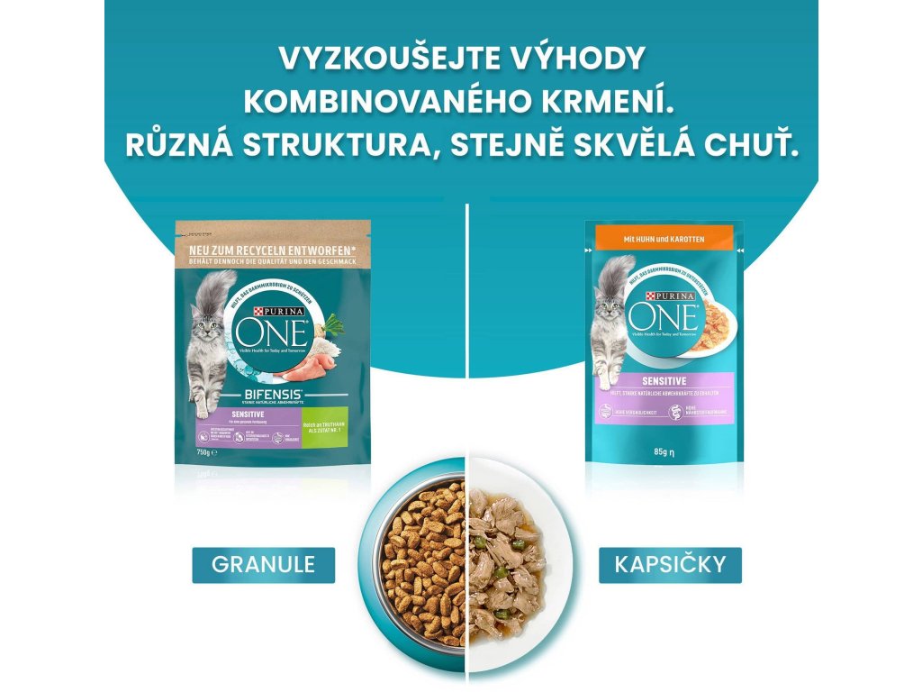 PURINA ONE® Sensitive je receptura speciálně navržená pro kočky s citlivým zažíváním a sníženou chutí k jídlu. Pro zdraví vaší kočky je nezbytný vyvážený střevní mikrobiom. Ten má přímý dopad na její imunitní systém. Mikrobiom je tvořen biliony mikroorganismů, které žijí ve střevech a jsou pro každou kočku unikátní. Rovnováha mikroorganismů je důležitá pro dobré zažívání a má pozitivní vliv na imunitní systém a celkovou pohodu vaší kočky.