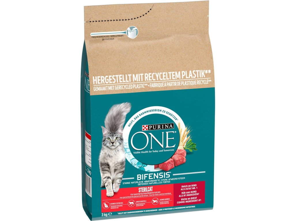 Kompletní krmivo pro dospělé kočky, Bohaté na hovězí a pšenici.Kompletní krmivo pro dospělé kočky.PURINA ONE BIFENSIS® je nutričně jedinečná receptura s prospěšnými bakteriemi, u kterých je vědecky prokázáno, že posilují přirozenou obranyschopnost vaší kočky uvnitř i navenek. Vyvinuto veterináři a experty na výživu společnosti Purina, PURINA ONE BIFENSIS® obsahuje prospěšné bakterie a všechny klíčové živiny, které vaše kočka potřebuje včetně omega - 6 mastných kyselin. Receptura s dvojím ochranným účinkem funguje uvnitř těla, tím že pomáhá podporovat přirozenou tvorbu protilátek vaší kočky, a zároveň podporuje vnější ochranu těla, kde udržuje kůži a srst kvalitní. PURINA ONE BIFENSIS® podporuje přirozenou obranyschopnost vaší kočky dnes i zítra.Navrženo s cílem pomoci udržet funkční metabolismus po kastraci / sterilizaci. Regulace hmotnosti díky vyššímu* poměru bílkovin k tukům (*+15 % oproti Adult receptuře) při dodržení krmného návodu. Díky vyváženému obsahu minerálních látek napomáhá udržet močový trakt zdravý. Prokazatelně snižuje tvorbu zubního kamene až o 40 %*. *výzkum PURINA. Velmi dobře vstřebatelné díky vysoké kvalitě ingrediencí. Bez přidaných barviv a umělých konzervantů.