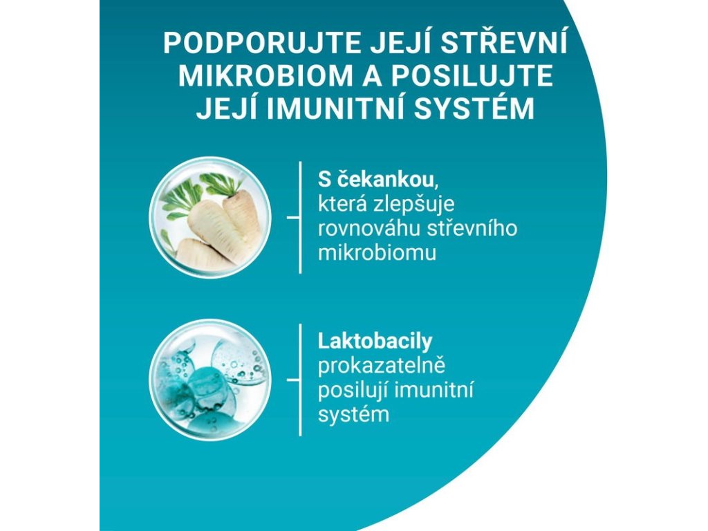 Díky prebiotiku z čekanky zlepšuje rovnováhu střevního mikrobiomu.