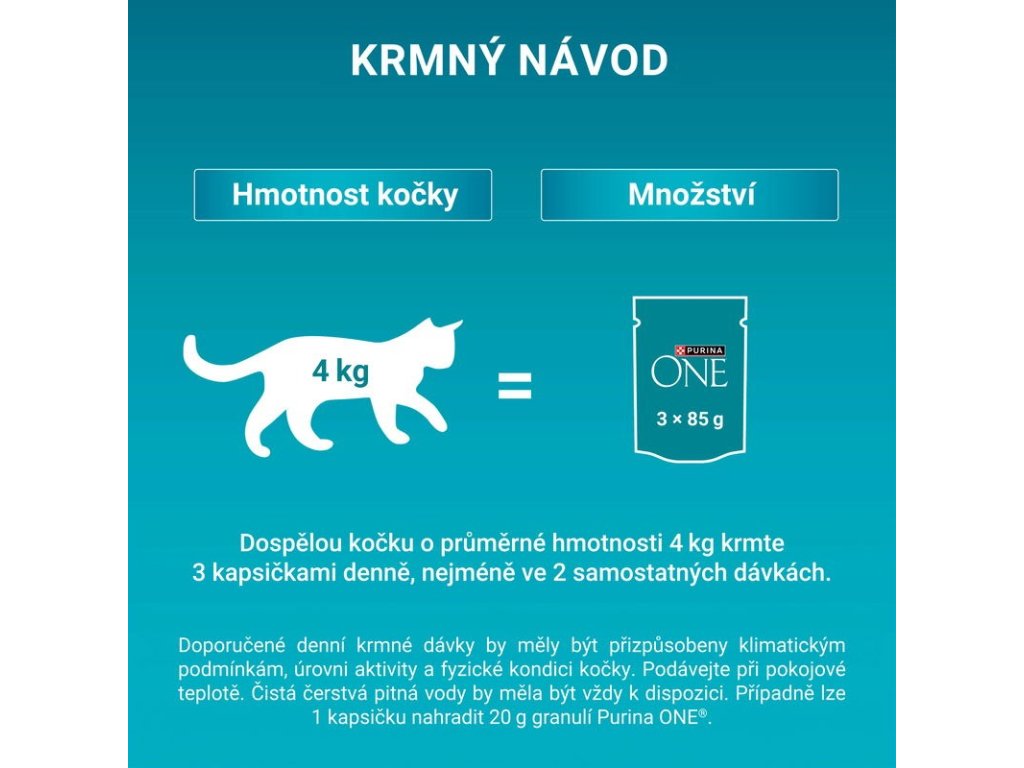 Doporučené denní krmné dávky by měly být přizpůsobeny klimatickým podmínkám, úrovni aktivity a fyzické kondici kočky. Podávejte při pokojové teplotě. Čistá čerstvá pitná voda by měla být vždy k dispozici. Případně lze 1 kapsičku nahradit 20 g granulí Purina ONE Adult.