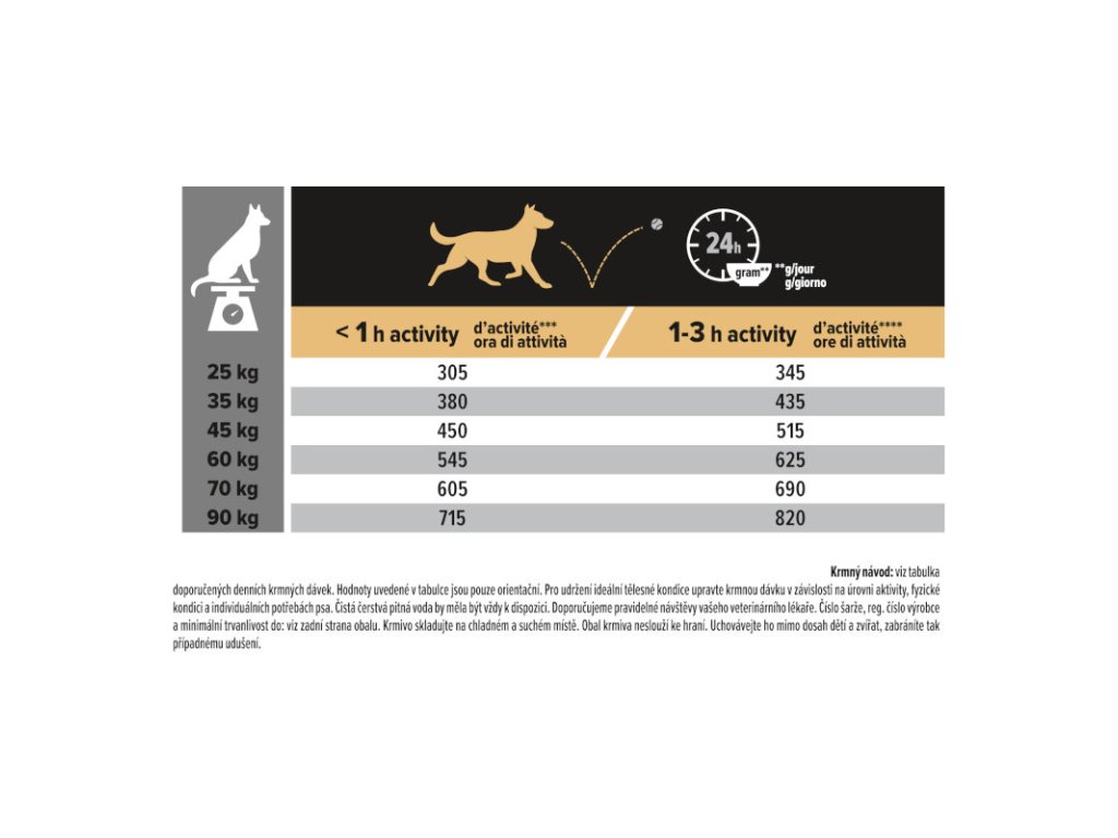 Krmný návod: viz tabulka doporučených denních krmných dávek. Hodnoty uvedené v tabulce jsou pouze orientační. Pro udržení ideální tělesné kondice upravte krmnou dávku v závislosti na úrovni aktivity, fyzické kondici a individuálních potřebách psa. Čistá čerstvá pitná voda by měla být vždy k dispozici. Doporučujeme pravidelné návštěvy vašeho veterinárního lékaře.