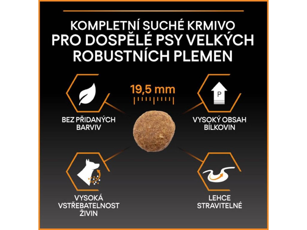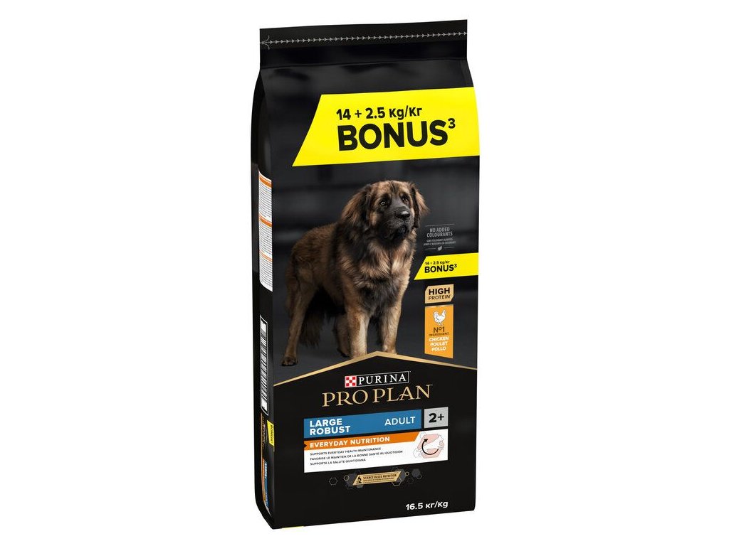 Krmivo Purina PRO PLAN® Everyday Nutrition LARGE ADULT ROBUST bylo vyvinuto pro dospělé psy velkých, robustních plemen (s hmotností nad 25 kg). Granule obsahují vitamín D, minerální látky a specifické množství omega-3 mastných kyselin (0,3 %), které přispívají ke zdraví zubů a dásní. Krmivo má vysoký podíl kvalitního kuřecího, a tak zajišťuje optimální výživu velkých plemen od 24 měsíců až do 7 let věku. Následně byste měli přejít na produkty z řady Age Defence.