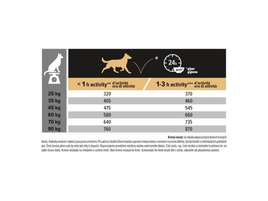 Krmný návod: viz tabulka doporučených denních krmných dávek. Hodnoty uvedené v tabulce jsou pouze orientační. Pro udržení ideální tělesné kondice upravte krmnou dávku v závislosti na úrovni aktivity, fyzické kondici a individuálních potřebách psa. Čistá čerstvá pitná voda by měla být vždy k dispozici. Doporučujeme pravidelné návštěvy vašeho veterinárního lékaře.