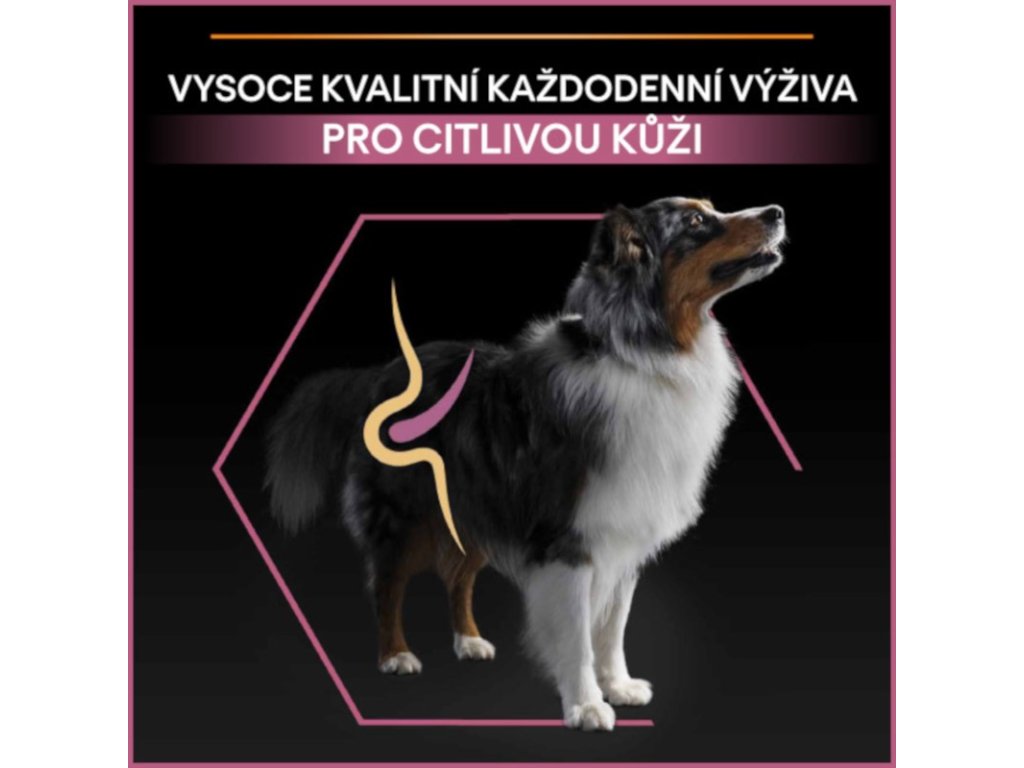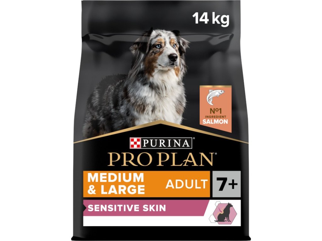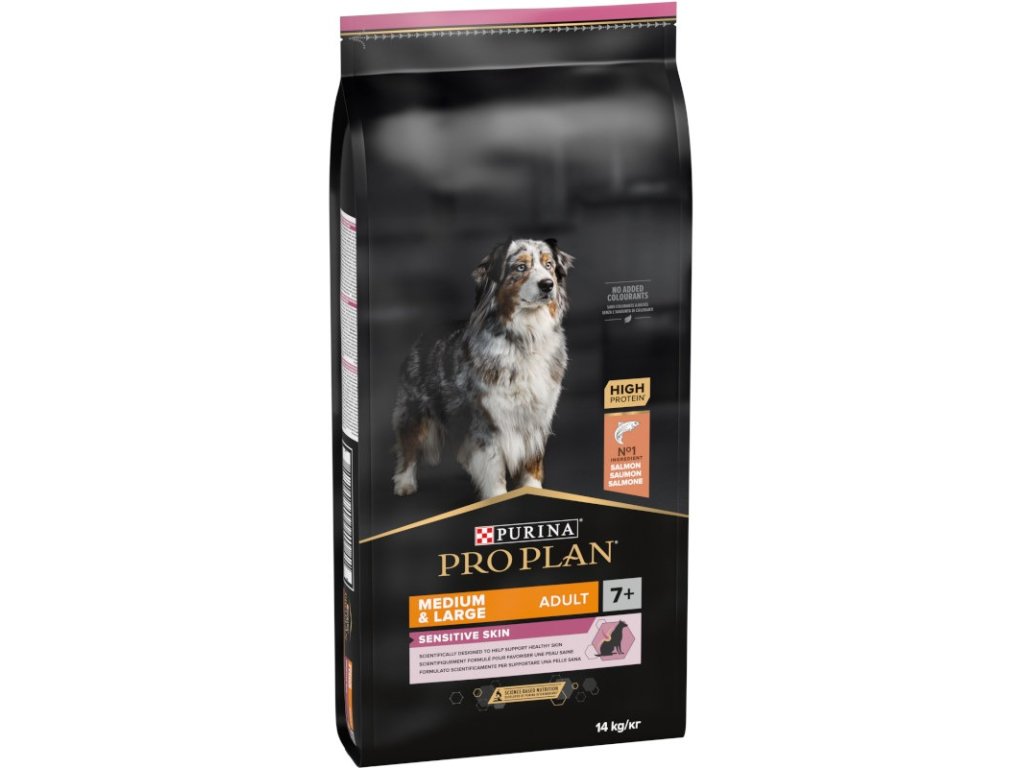 Krmivo Purina PRO PLAN® Sensitive Skin MEDIUM&LARGE ADULT 7+ bylo vyvinuto pro starší psy středních a velkých plemen (s hmotností nad 10 kg). Granule obsahují vitamín D, minerální látky a specifické množství omega-3 mastných kyselin (0,7 %), které přispívají ke zdraví zubů a dásní. Krmivo má vysoký podíl lososa, a tak zajišťuje optimální výživu starších psů, jejichž věk překročil hranici 7 let.