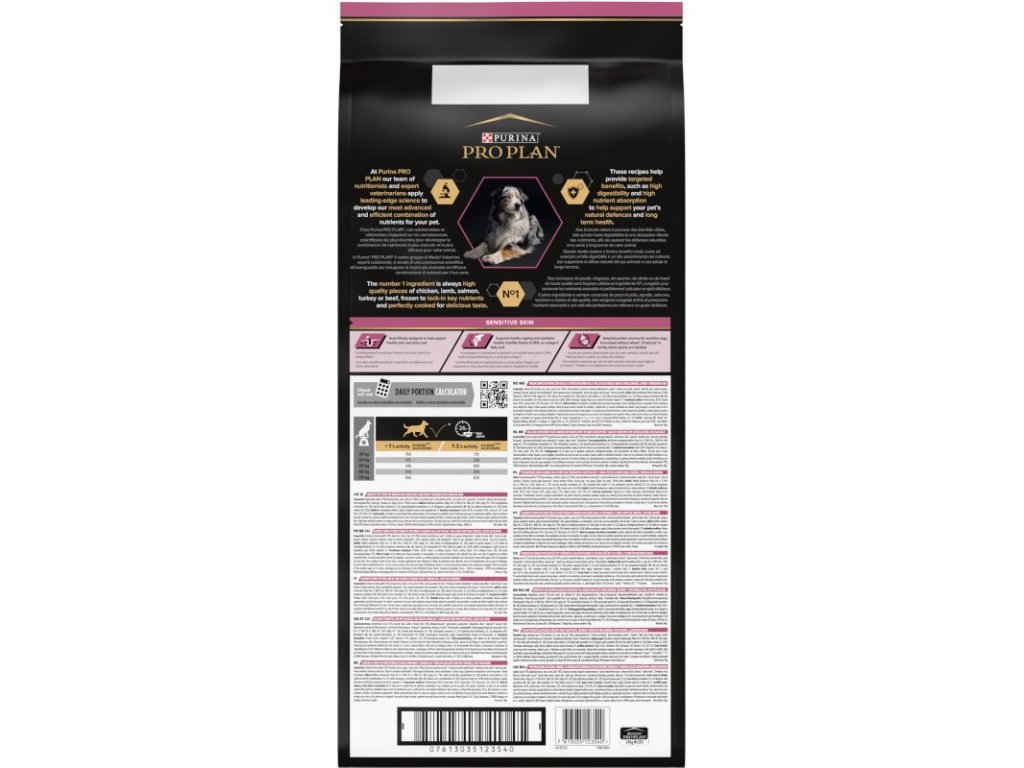 Hlavní složkou krmiva Purina PRO PLAN® Sensitive Skin jsou kousky vysoce kvalitního lososa. Granule jsou navržené tak, aby se svým složením přizpůsobily specifickým potřebám psů s citlivou kůží. Obsahují totiž vybrané zdroje bílkovin a nevyskytuje se v nich žádná pšenice. Zvýšené množství omega-3 mastných kyselin s dlouhým řetězcem (0,7 %) pomáhá citlivé kůži. Obsah bílkovin a tuků je nastaven tak, aby přispíval k udržení optimální váhy. EPA, omega-3 mastné kyseliny, podporují pohyblivost kloubů a pomáhají vašemu psovi zdravě stárnout.