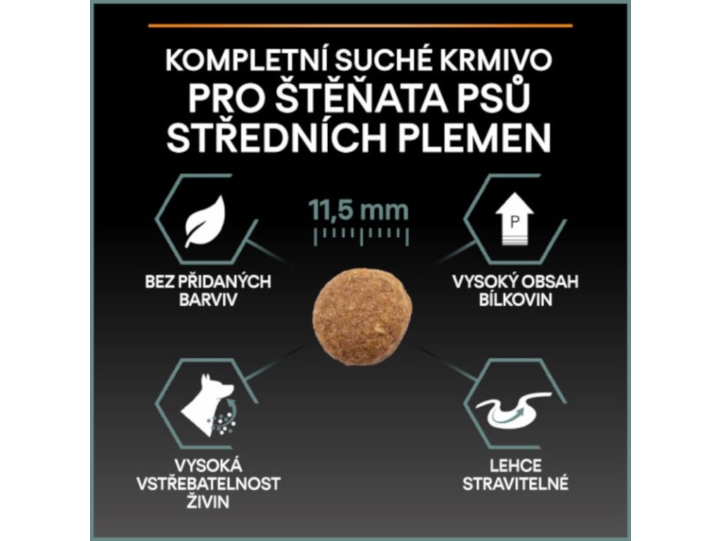 Krmivo Purina PRO PLAN® Sensitive Digestion MEDIUM PUPPY bylo vyvinuto pro štěňata středních plemen (váha v dospělosti 10–25 kg). Tyto granule pro štěňata obsahují vitamín D a minerální látky, které podporují silné a zdravé zuby. Krmivo má velký podíl vysoce kvalitního jehněčího, a tak zajišťuje optimální výživu štěňat středních plemen až do 12 měsíců. Následně byste měli přejít na produkty z řady Adult.