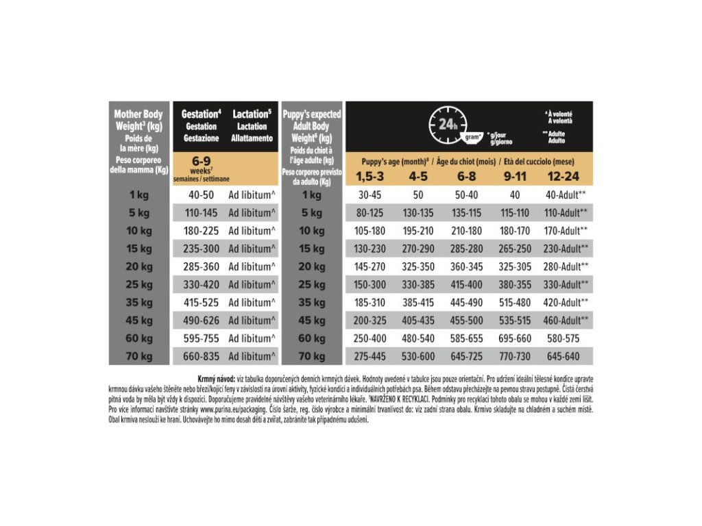 Krmný návod: viz tabulka doporučených denních krmných dávek. Hodnoty uvedené v tabulce jsou pouze orientační. Pro udržení ideální tělesné kondice upravte krmnou dávku vašeho štěněte nebo březí/kojící feny v závislosti na úrovni aktivity, fyzické kondici a individuálních potřebách psa. Během odstavu přecházejte na pevnou stravu postupně. Čistá čerstvá pitná voda by měla být vždy k dispozici. Doporučujeme pravidelné návštěvy vašeho veterinárního lékaře.