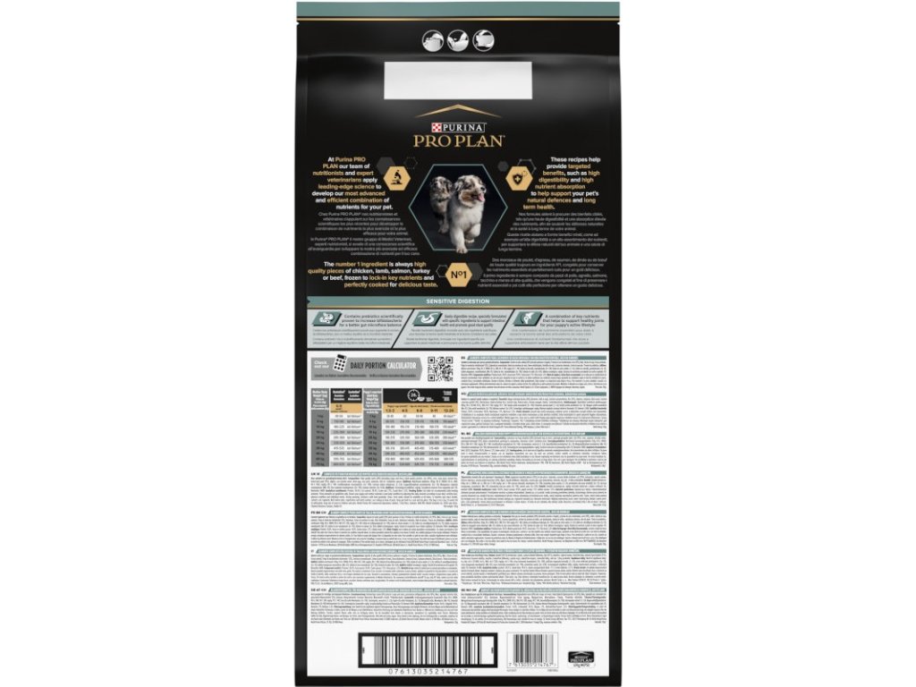 Hlavní složkou krmiva pro psy Purina PRO PLAN® Sensitive Digestion jsou kvalitní kousky jehněčího a další vysoce stravitelné složky, které usnadňují trávicí proces. Tyto granule pro štěňata obsahují také prebiotika, u nichž bylo vědecky prokázáno, že zvyšují množství bifidobakterií, které zlepšují rovnováhu střevní mikroflóry, a bentonit (přírodní jíl), který podporuje správné vyprazdňování. Vysoký obsah bílkovin pomáhá udržovat silné svaly a ideální kondici.