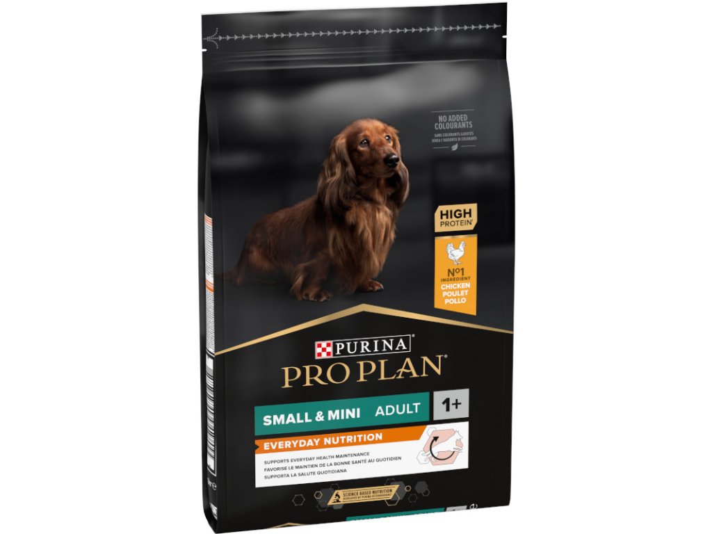 Krmivo Purina PRO PLAN® Everyday Nutrition SMALL&MINI ADULT bylo vyvinuto pro dospělé psy malých a trpasličích plemen (s hmotností do 10 kg). Granule obsahují vitamín D, minerální látky a specifické množství omega-3 mastných kyselin (0,3 %), které přispívají ke zdraví zubů a dásní. Krmivo má vysoký podíl kvalitního kuřecího, a tak zajišťuje optimální výživu psů malých a trpasličích plemen od 12 měsíců až do 9 let. Následně byste měli přejít na produkty z řady Age Defence.