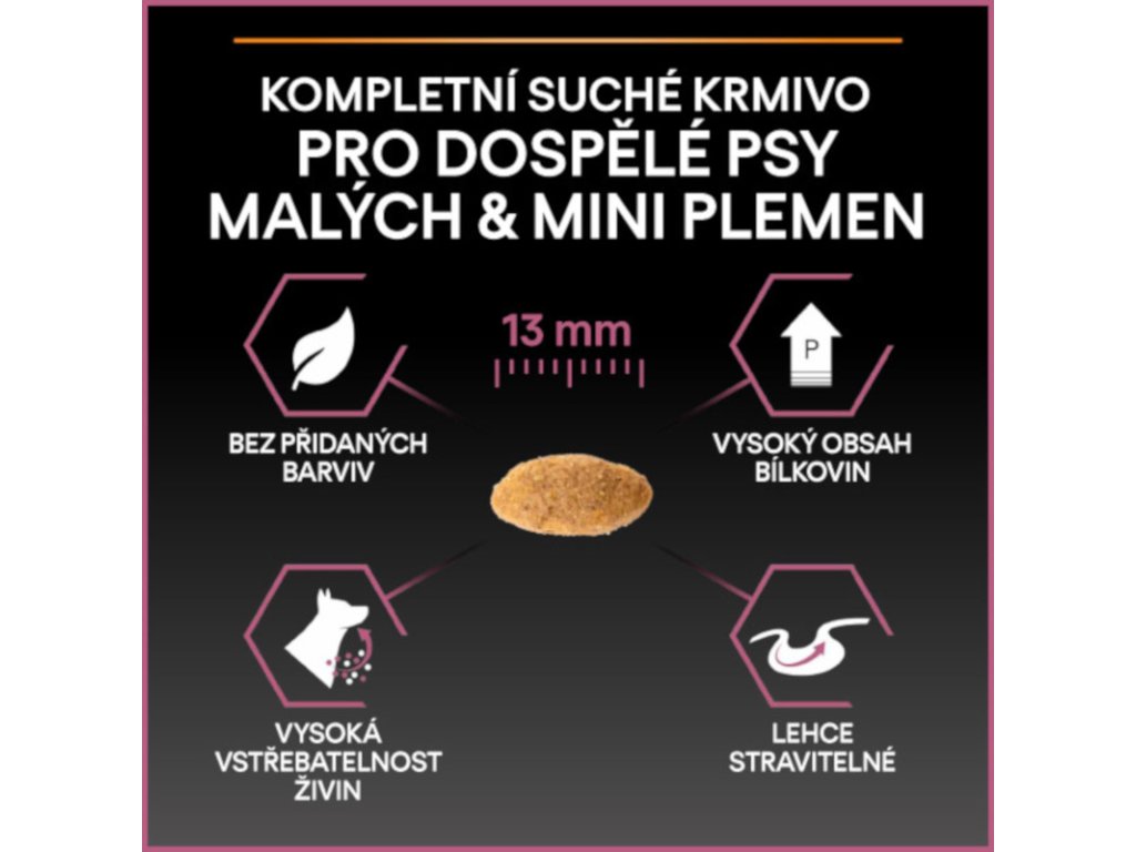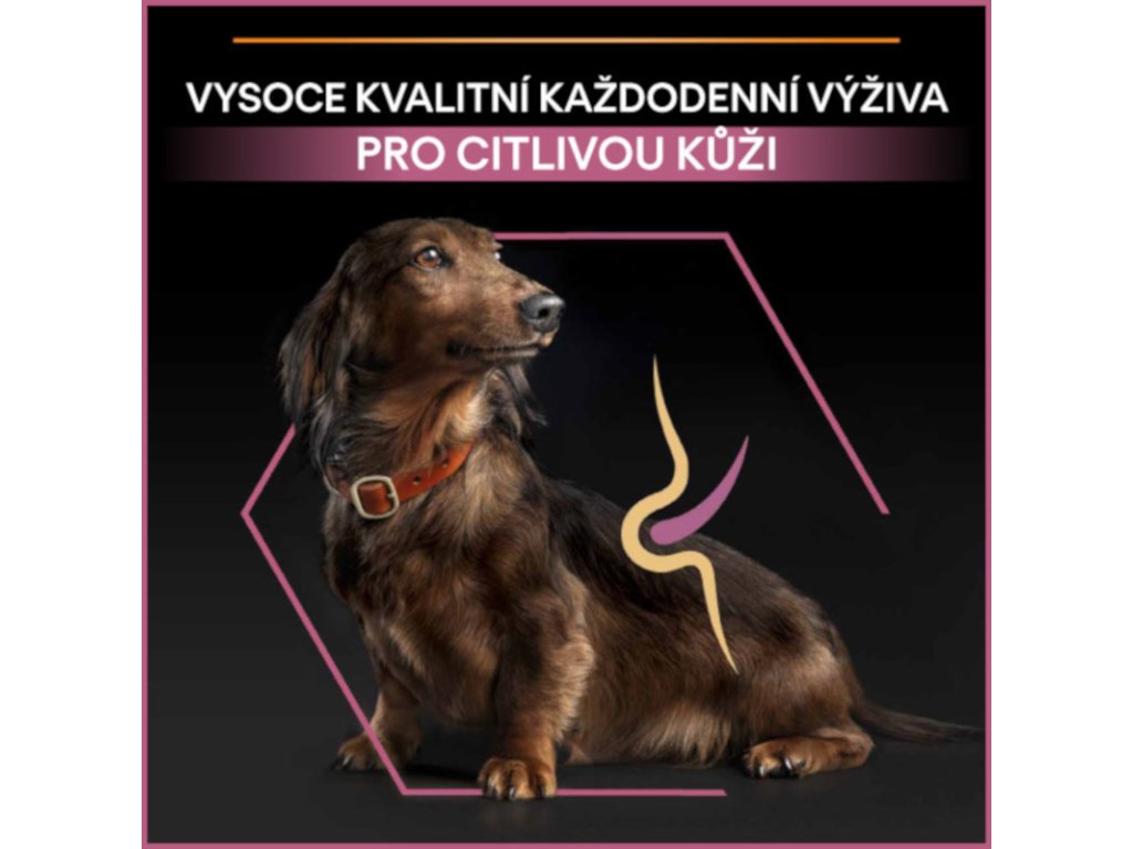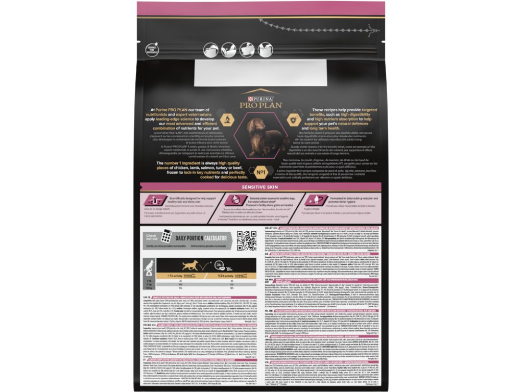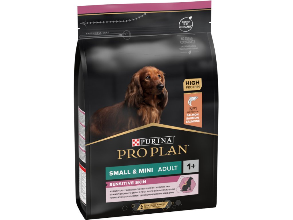 Hlavní složkou krmiva Purina PRO PLAN® Sensitive Skin jsou kousky vysoce kvalitního lososa. Granule jsou navržené tak, aby se svým složením přizpůsobily specifickým potřebám psů s citlivou kůží. Obsahují totiž vybrané zdroje bílkovin a nevyskytuje se v nich žádná pšenice. Zvýšené množství omega-3 mastných kyselin s dlouhým řetězcem (0,8 %) pomáhá citlivé kůži. Vysoký obsah bílkovin podporuje silné svaly, ideální tělesnou kondici a celkovou spokojenost vašeho psa. Krmivo bylo sestaveno tak, aby i citliví psi dobře prospívali. Krmivo Purina PRO PLAN® Sensitive Skin SMALL&MINI ADULT bylo vyvinuto pro dospělé psy malých a trpasličích plemen (s hmotností do 10 kg). Granule obsahují vitamín D, minerální látky a specifické množství omega-3 mastných kyselin (0,8 %), které přispívají ke zdraví zubů a dásní. Krmivo má vysoký podíl lososa, a tak zajišťuje optimální výživu malých a trpasličích plemen od 12 měsíců až do 9 let. Následně byste měli přejít na produkty z řady Age Defence.