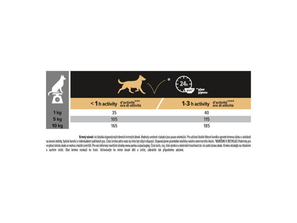 Krmný návod: viz tabulka doporučených denních krmných dávek. Hodnoty uvedené v tabulce jsou pouze orientační. Pro udržení ideální tělesné kondice upravte krmnou dávku v závislosti na úrovni aktivity, fyzické kondici a individuálních potřebách psa. Čistá čerstvá pitná voda by měla být vždy k dispozici. Doporučujeme pravidelné návštěvy vašeho veterinárního lékaře.