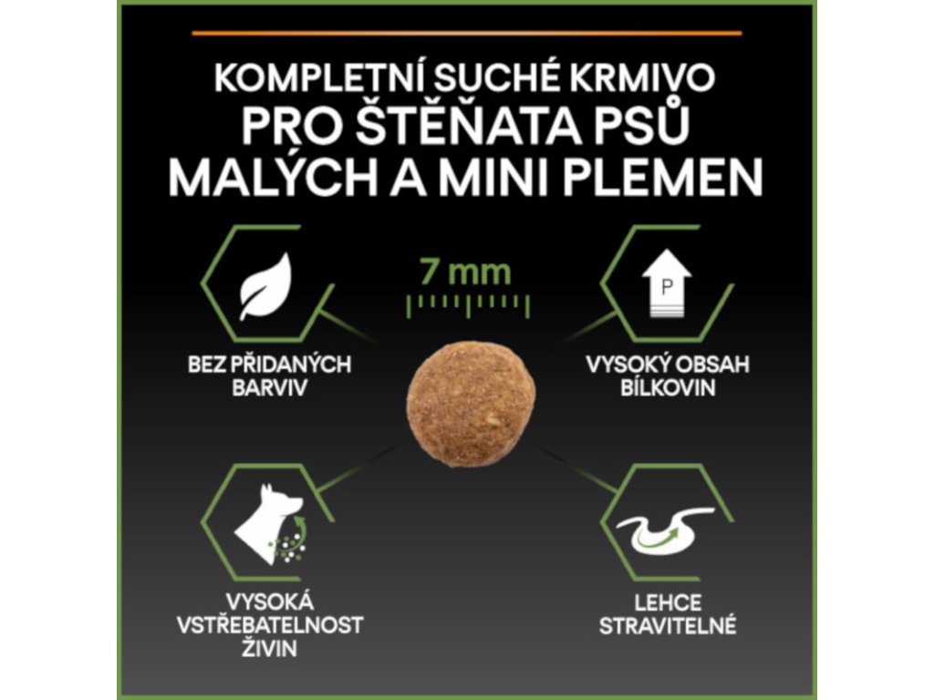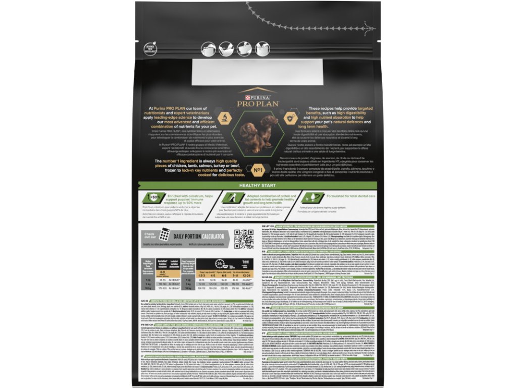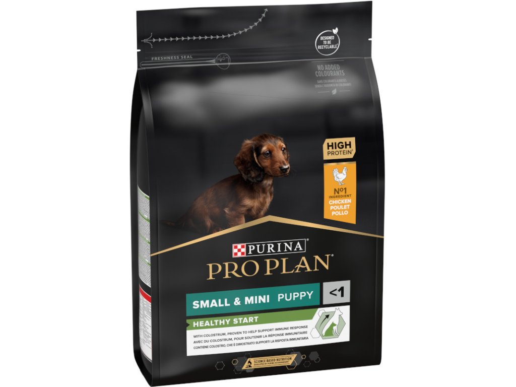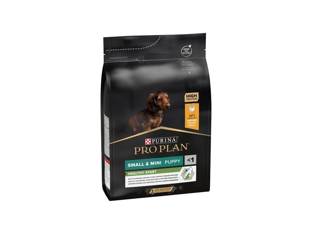 Krmivo Purina PRO PLAN® Healthy Start SMALL&MINI PUPPY je vhodné pro štěňata malých a trpasličích plemen (s hmotností do 10 kg v dospělosti). Tyto granule pro štěňata obsahují vitamín D, minerální látky a specifické množství omega-3 mastných kyselin (0,4 %), které přispívají ke zdraví zubů a dásní. Krmivo má vysoký podíl kvalitního kuřecího, a tak zajišťuje optimální výživu pro rostoucí štěňata malých a trpasličích plemen. To vše až do věku 12 měsíců, kdy přejdou na produkty řady ADULT.