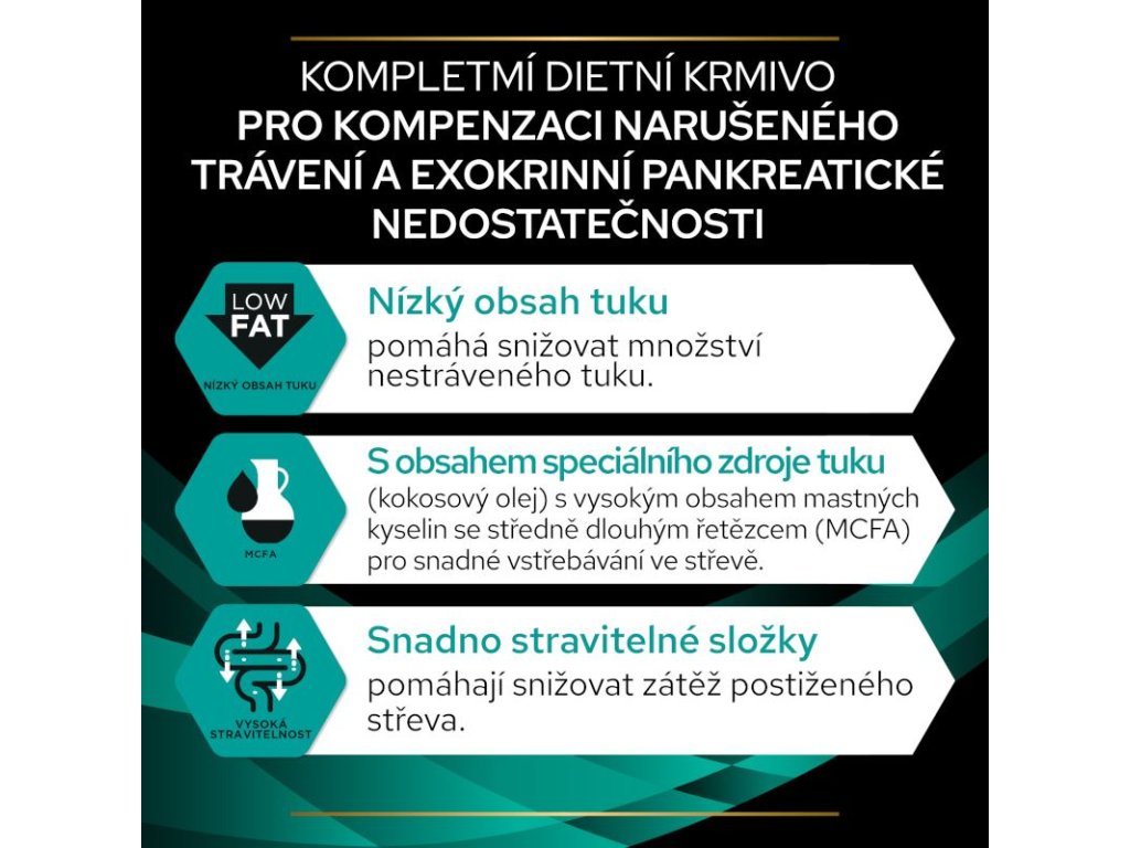 Kompletní vysoce stravitelné dietní krmivo s nízkým obsahem vlákniny pro štěňata a dospělé psy určené ke kompenzaci maldigesce a exokrinní pankreatické nedostatečnosti.