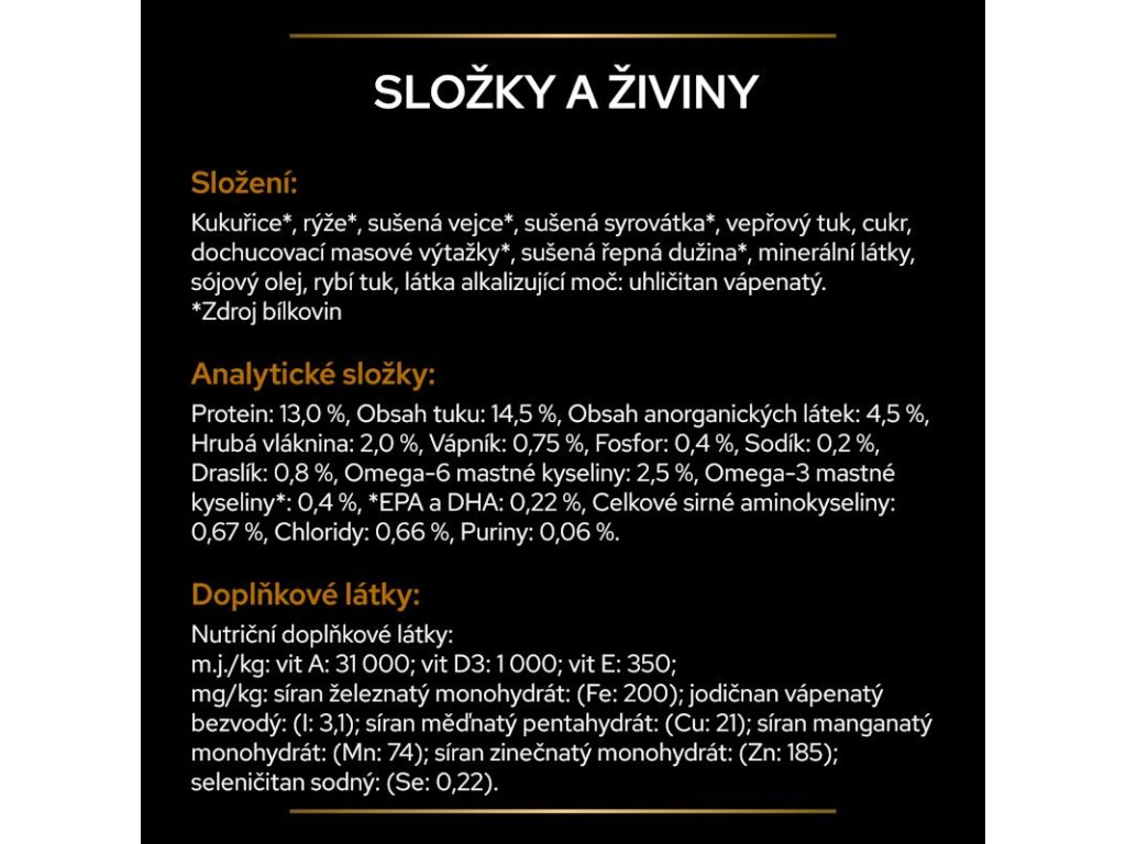 Složení: kukuřice, rýže, sušená vejce, sušená syrovátka, vepřový tuk, cukr, dochucovací masové výtažky, sušená řepná dužina, minerální látky, sójový olej, rybí tuk, látka alkalizující moč: uhličitan vápenatý.
