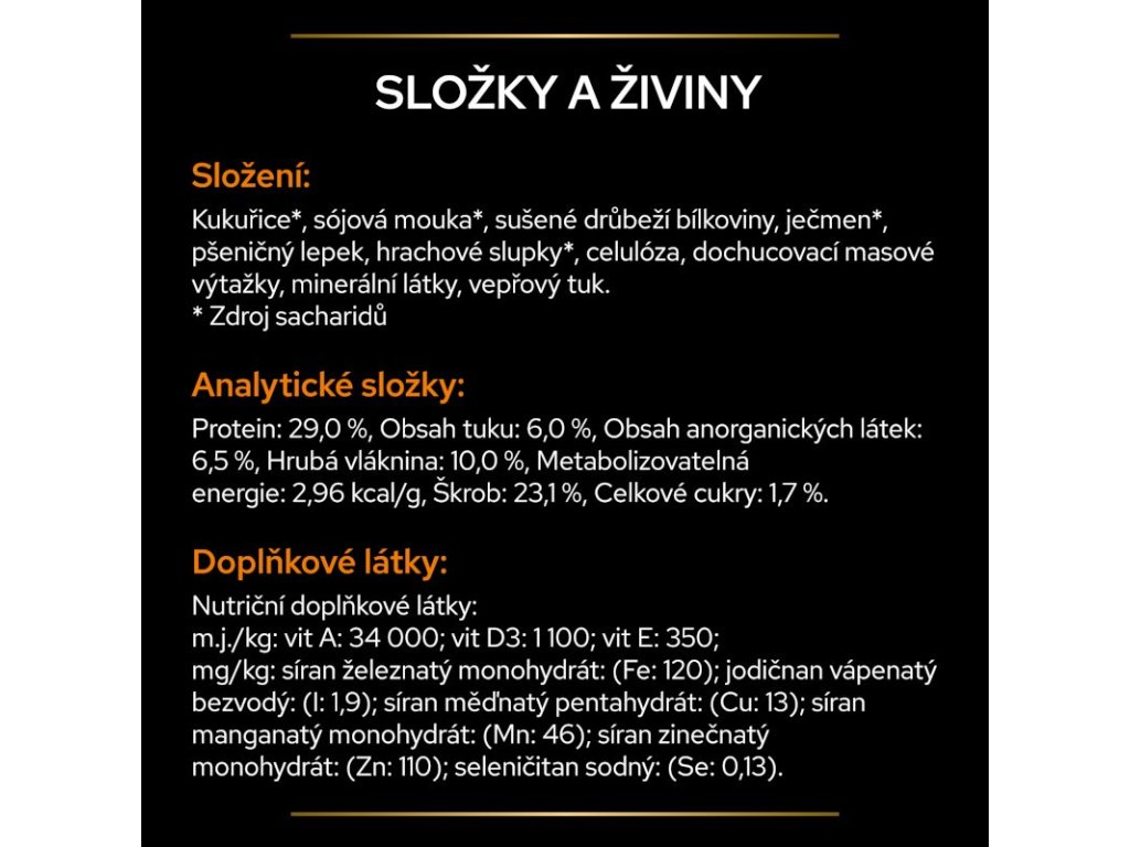 Analytické složky: protein 29 %, obsah tuku 6 %, obsah anorganických látek 6,5 %, hrubá vláknina 10 %, metabolizovatelná energie 2,96 kcal/g, škrob 23,1 %, celkové cukry 1,7 %.