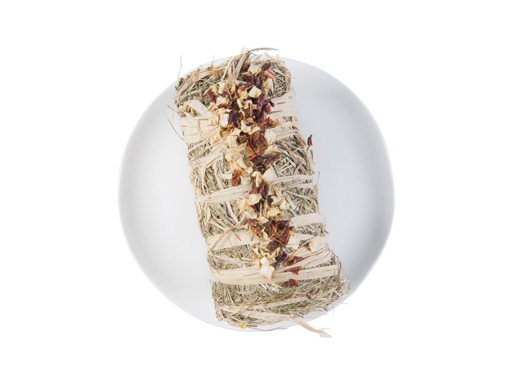 100% přírodní zábavný pamlsek pro býložravé drobné savce. Králíci, morčata, činčily a osmáci si nejen pochutnají na voňavém seně, sušeném celeru a paprice, ale zároveň rozplétáním rolky zaženou nudu.