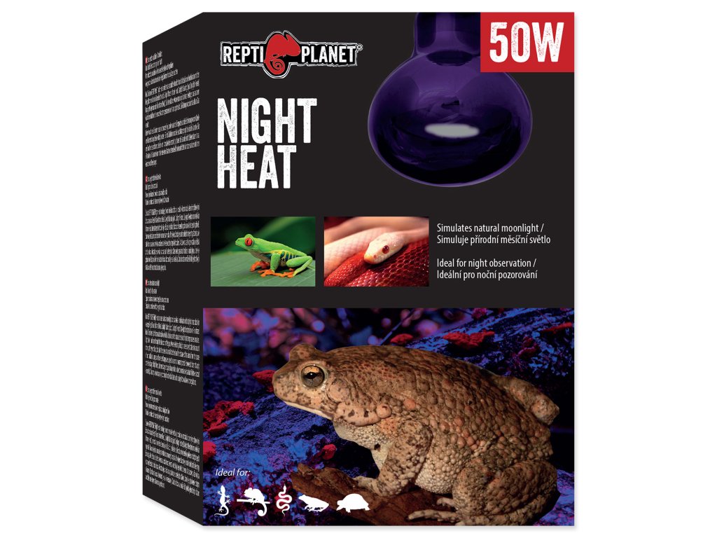 Žárovka REPTI PLANET Night Heat simuluje přírodní měsíční světlo a je ideální v kombinaci s denními výhřevnými žárovkami (např. Repti Planet Infrared Heat, Daylight Basking Spot, Daylight Frosted, Daylight Neodymium nebo Far Infrared Heat). Intenzita tepelného záření je nižší, což je ideální z důvodu přirozeného poklesu nočních teplot v přírodě.